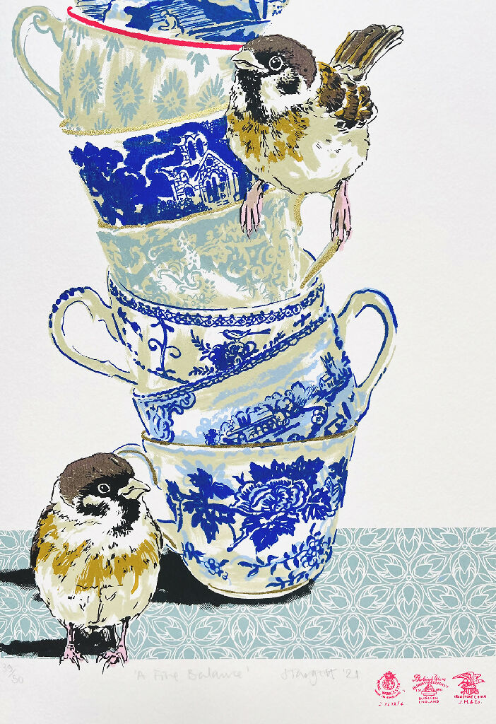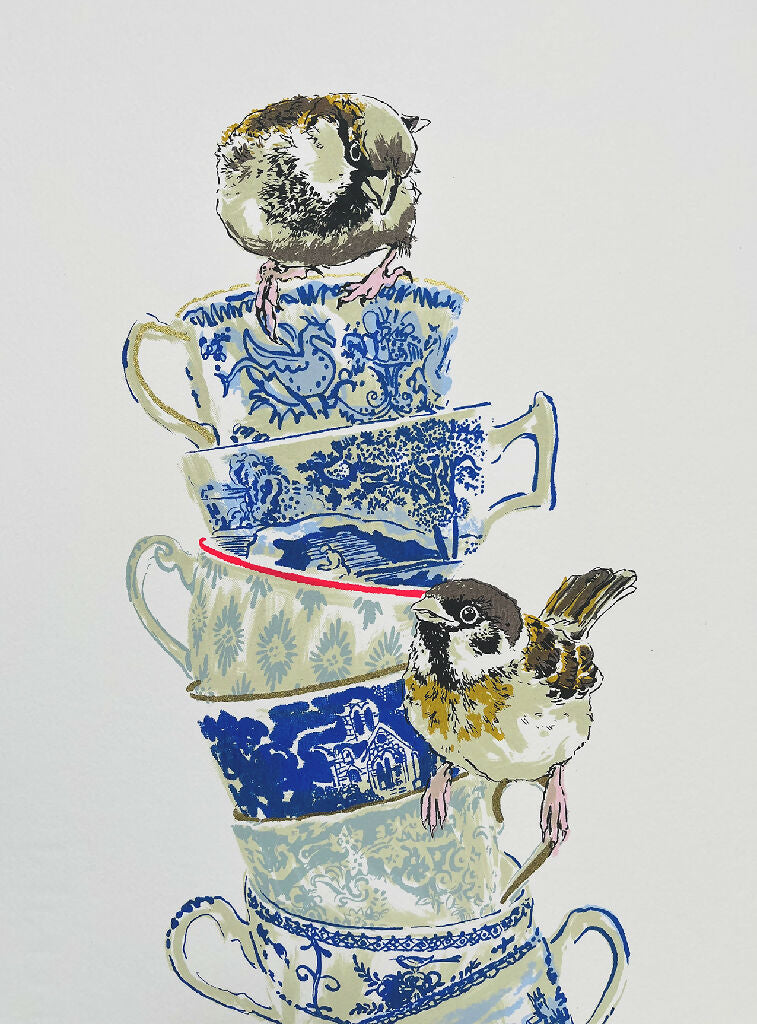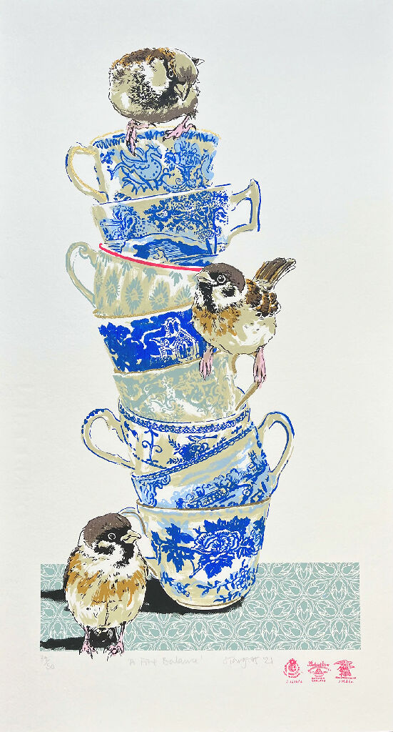 A Fine Balance is 10 colour Limited edition silkscreen print on Fabriano paper. Featuring a teetering stack of vintage blue and white china cups. Some china makers marks are printed at the bottom in bright pink ink.
