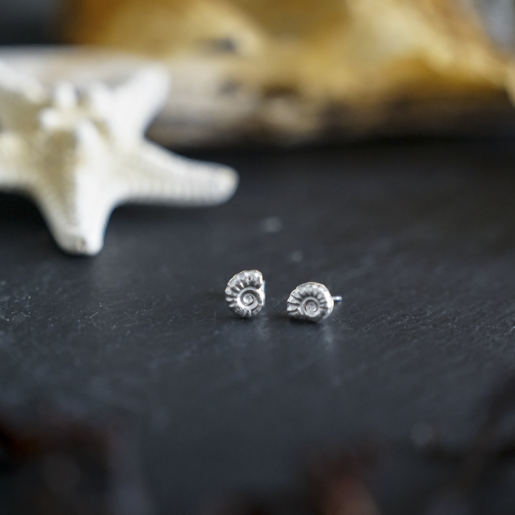 Ancient tides, captured in silver.Hand-cast in sterling silver from an ammonite found along the Dorset coast, these studs carry the spiral story of the sea through time.A symbol...
