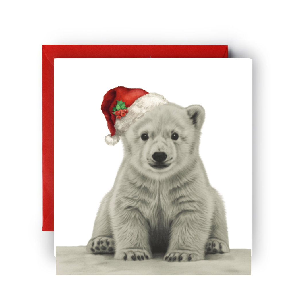Classic Christmas Appeal: Combines the beloved polar bear with the iconic Santa hat to create a universally appealing and cozy holiday greeting.