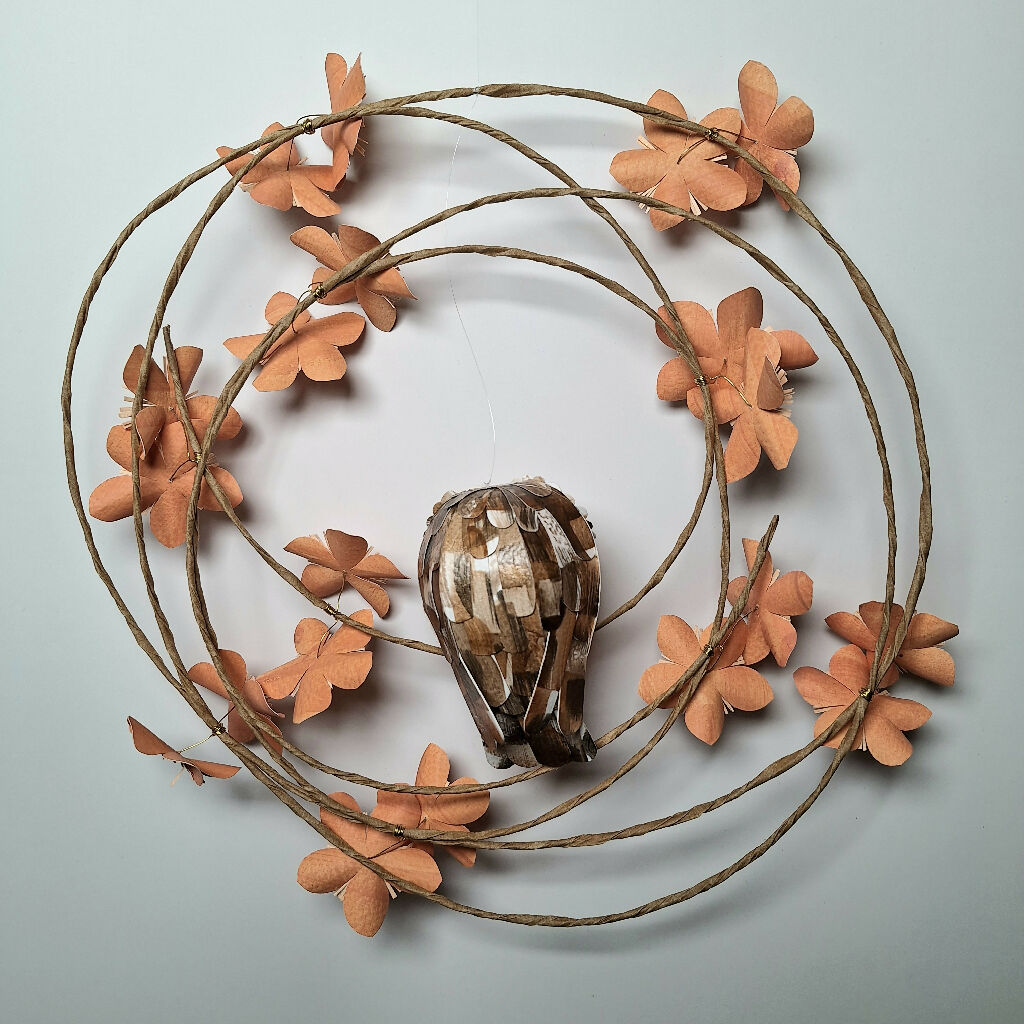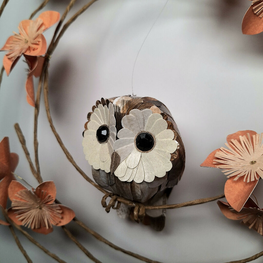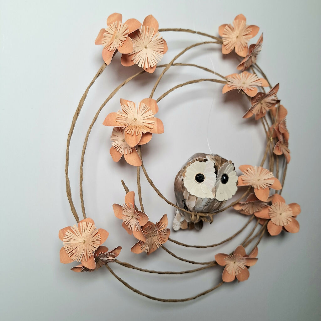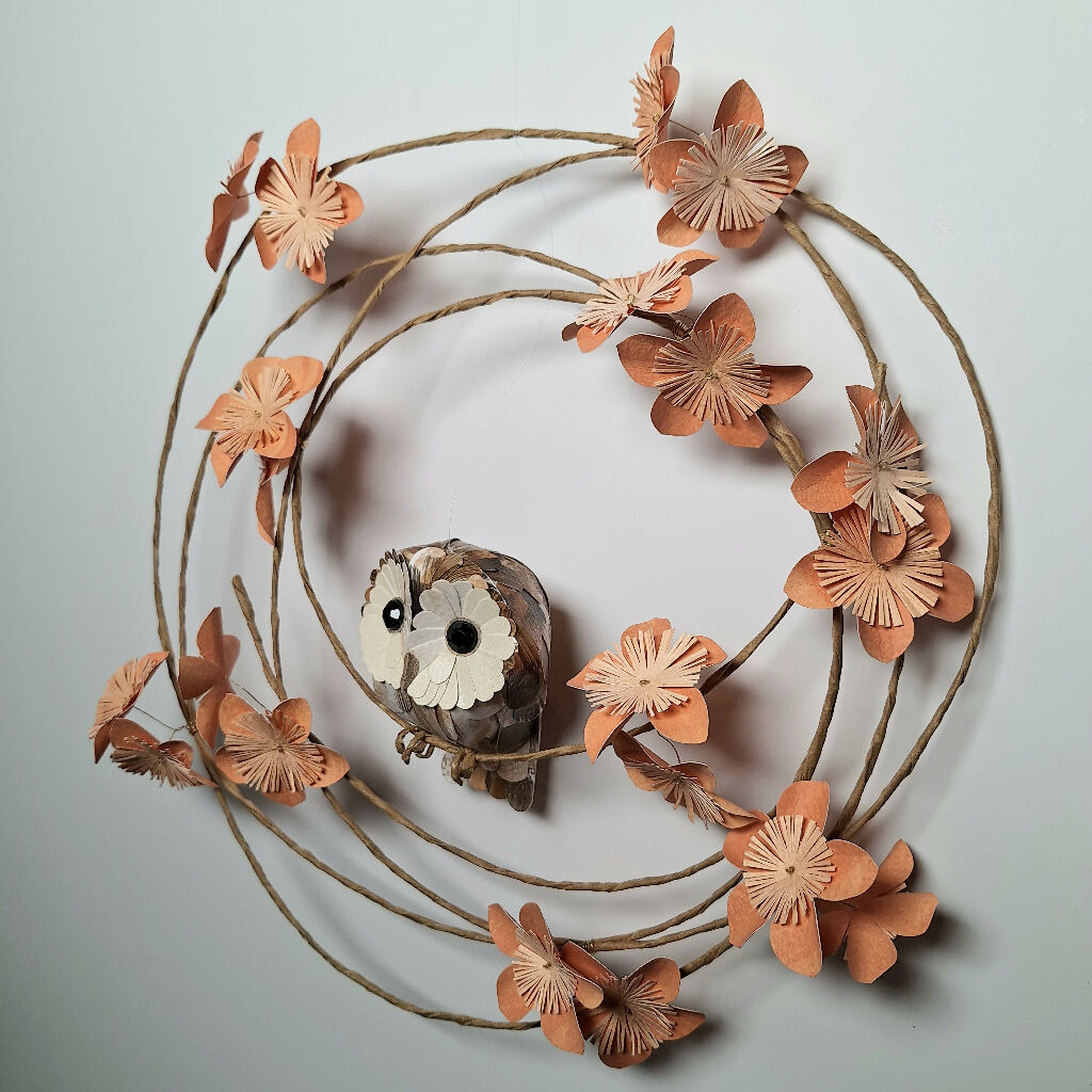 This floral wreath features a baby tawny owl sculpture, in warm brown tones and a soft golden face. He perches on a wreath adorned with pale orange clematis flowers. This paper sculpture wall art is one of a kind.