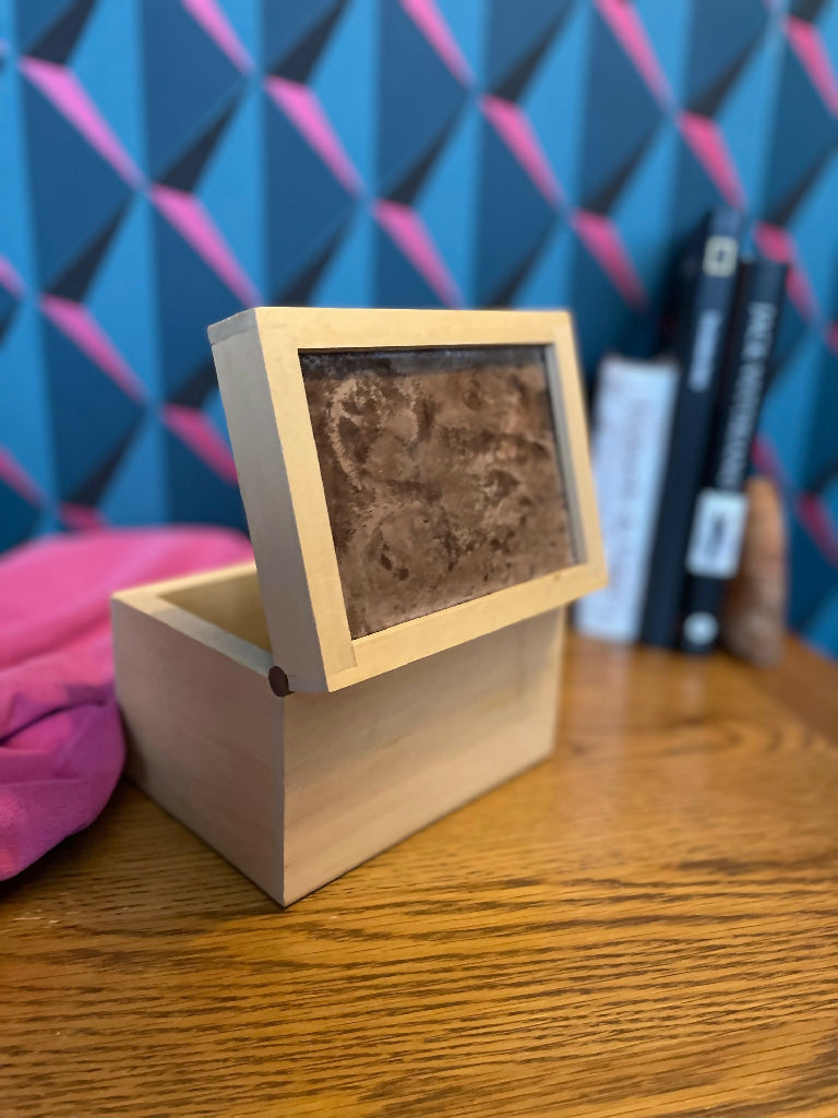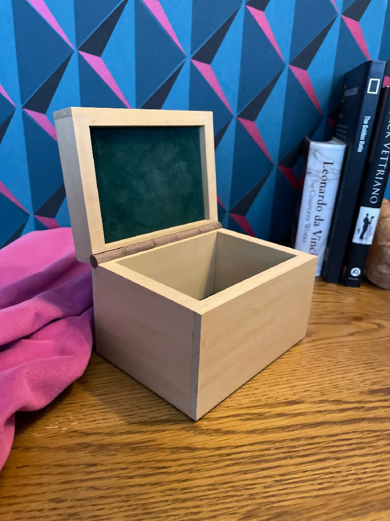 Solid birch box body, Walnut lid recessed for additional detail. British racing green leather interior. Finished with a light shellac.