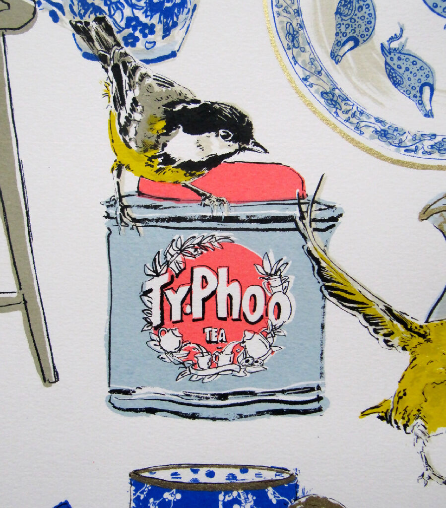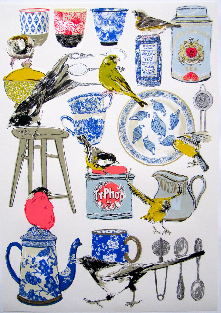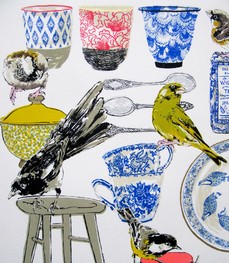 15 colour Limited edition silkscreen print on Fabriano paper with silver and gold ink. An ode to drinking tea whilst watching the birds.