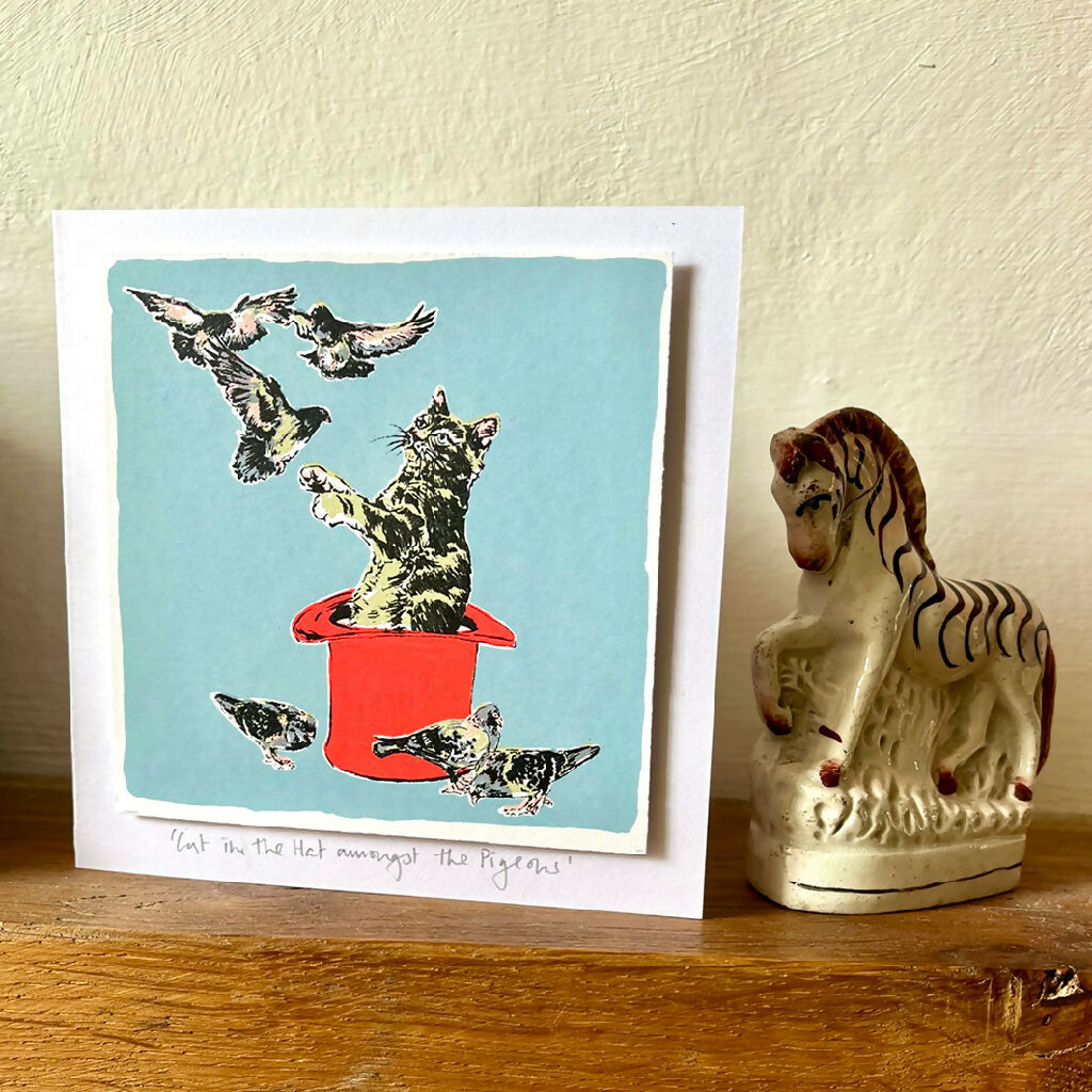 Hand screenprinted cat themed greetings card with 7 colours , including a vibrant raspberry red hat. The card is a ‘mini print’ which is stuck on to a recycled card back. The print is slightly raised from the card backing.