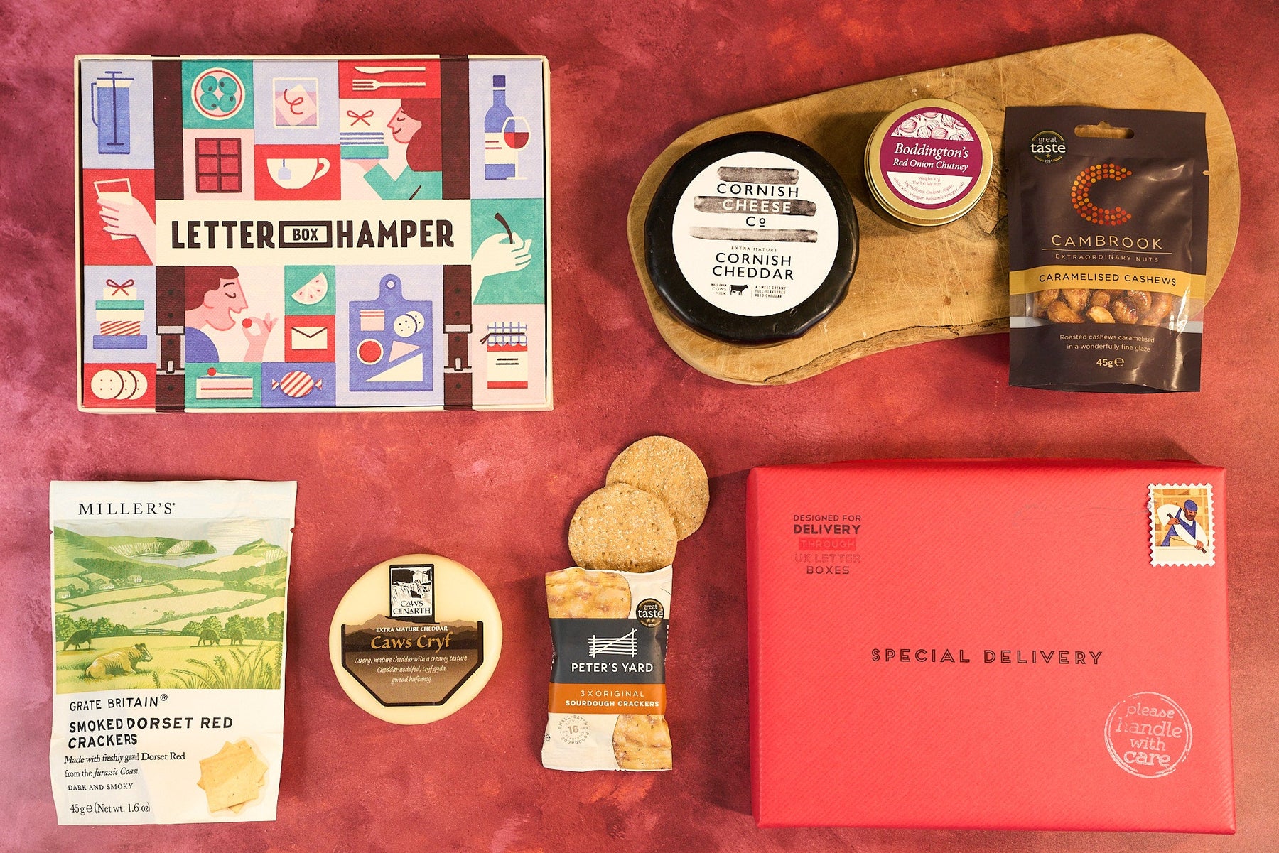 Beautifully wrapped in traditional parcel paper, with twine and ink stamps, this new larger edition of our letterbox cheese hamper contains two of Britain's best cheeses - Caws Cryf from Wales and Cornish Cheese Company extra mature cheddar - as well as biscuits for cheese, sourdough crackers, salted nuts and red onion chutney.