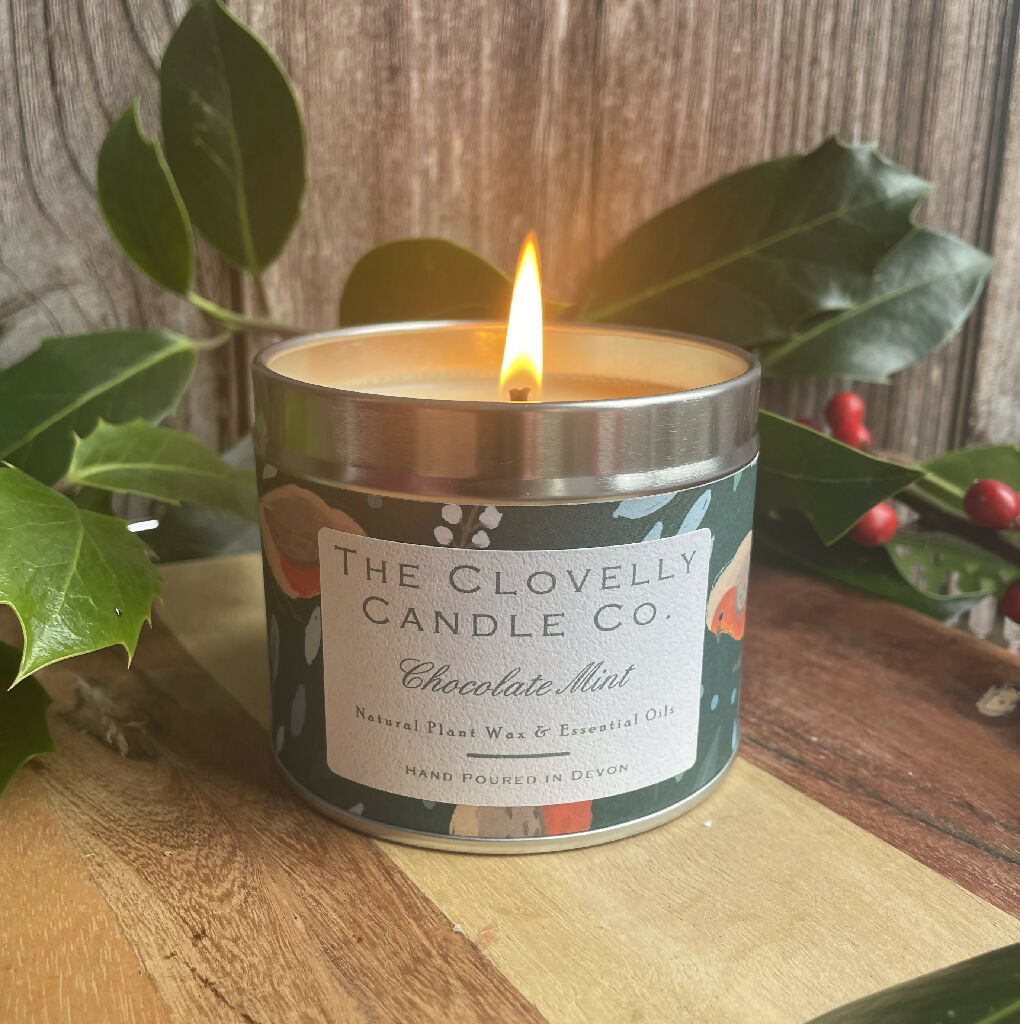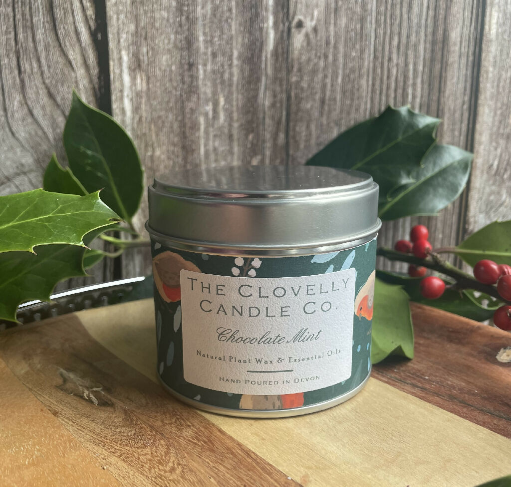 Handmade Chocolate Mint 100g Soap Bar wrapped in festive paper with a Merry Christmas Label and Matching Large Tin Candle Hand poured using Soya Wax and Essential oils. Perfect Hostess Gift for friends and Family or to make your own home Christmas Ready.
