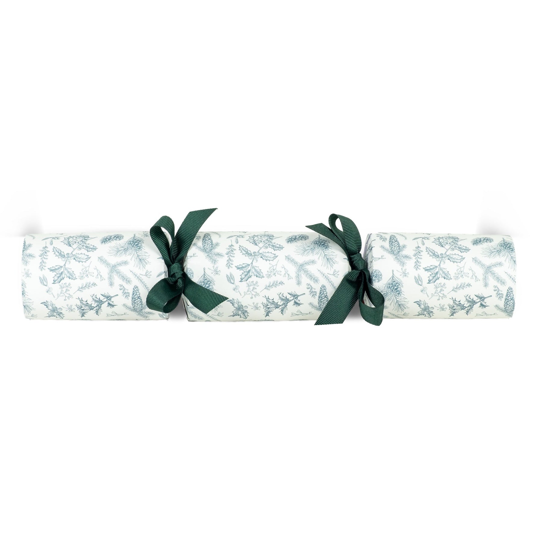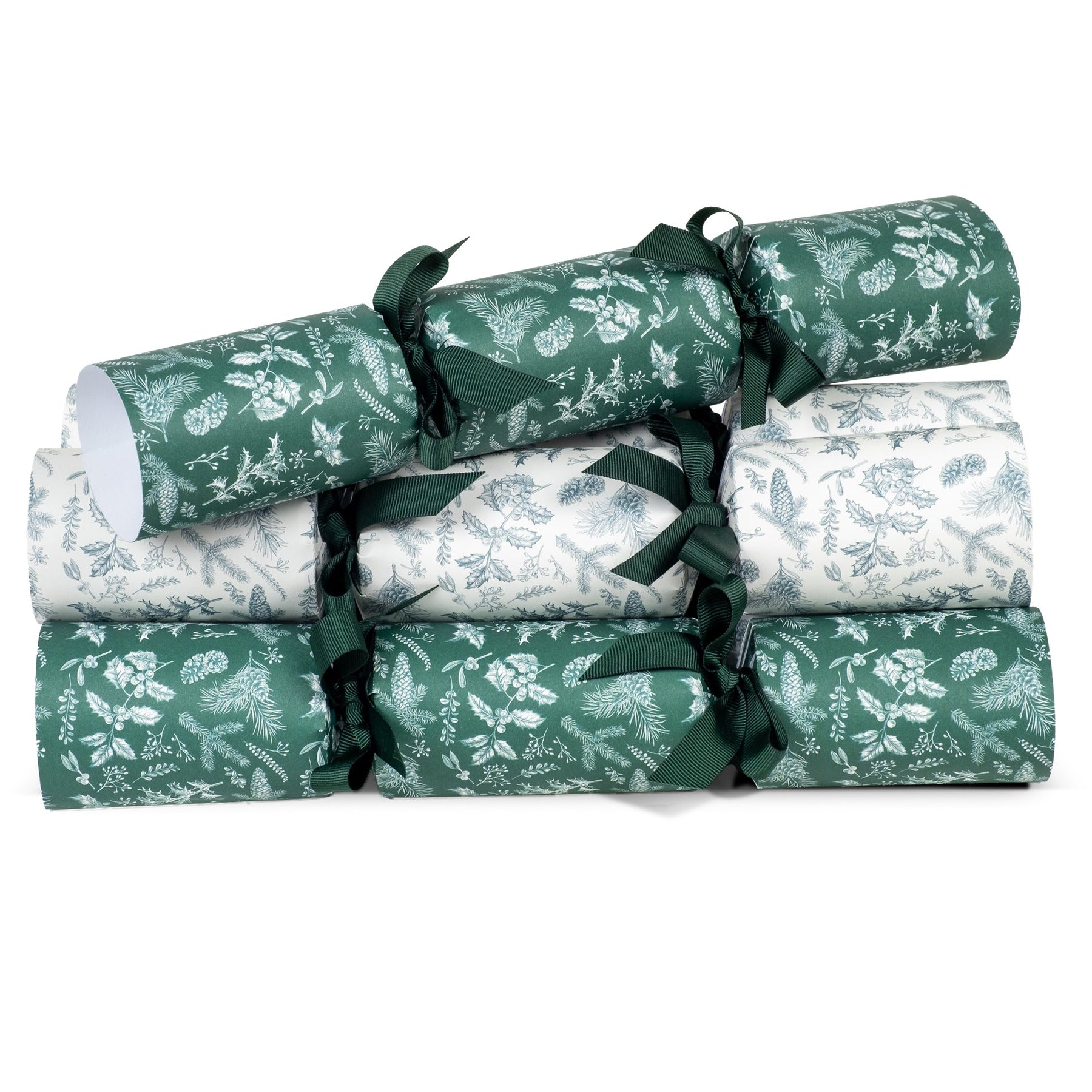 Six alternate white and green luxury Christmas crackers, with holly, fir cone, mistletoe, and fern imagery, tied with recycled polyester ribbon.