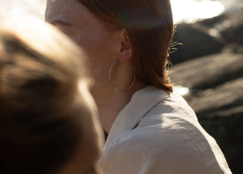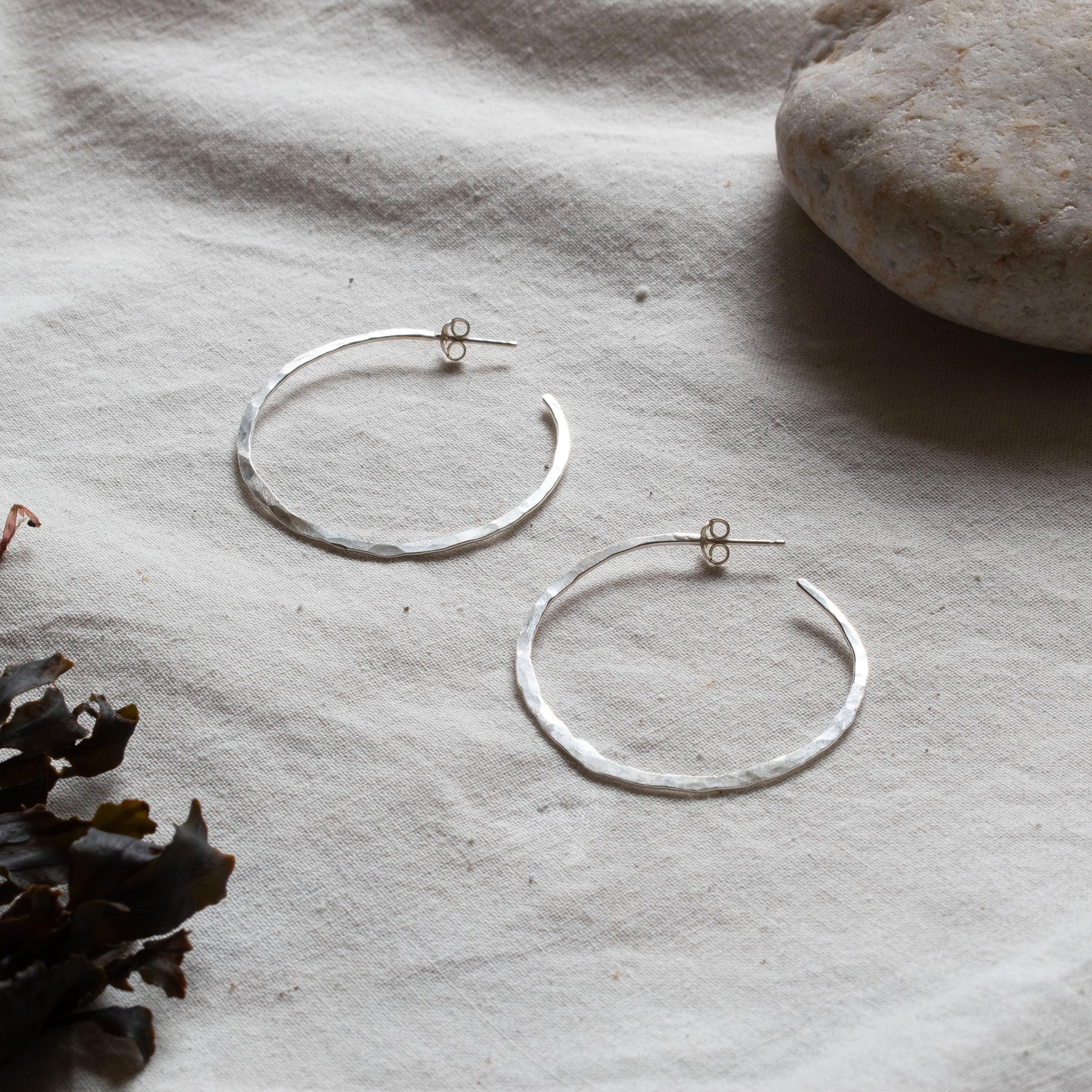 These gorgeous statement Crescent Hoops are made with battered recycled silver and made to order in my small Penryn Studio space. Sara (second image) is wearing the large hoops ...