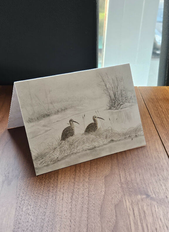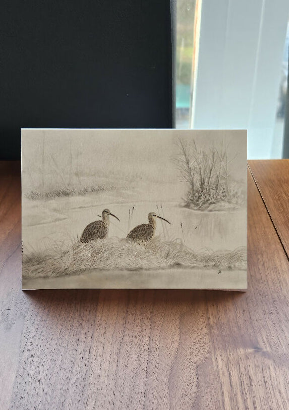 This Christmas card features a pair of elegant curlews at the edge of a brackish lagoon against a winter backdrop, printed from my original artwork on premium matte 310gsm paper...