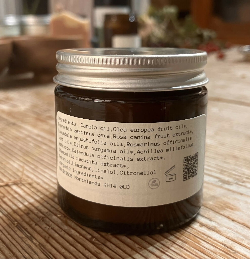 A beautifully rich yet gentle plant based salve with sustainable oils infused with organic chamomile, calendula, yarrow and oat. Made with sustainable candelilla wax and gently scented with organic essential oils. This salve can be used all over the body from top to toe.