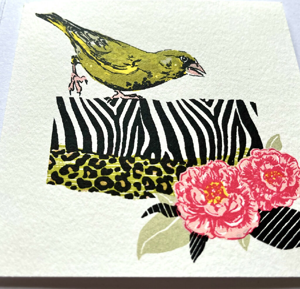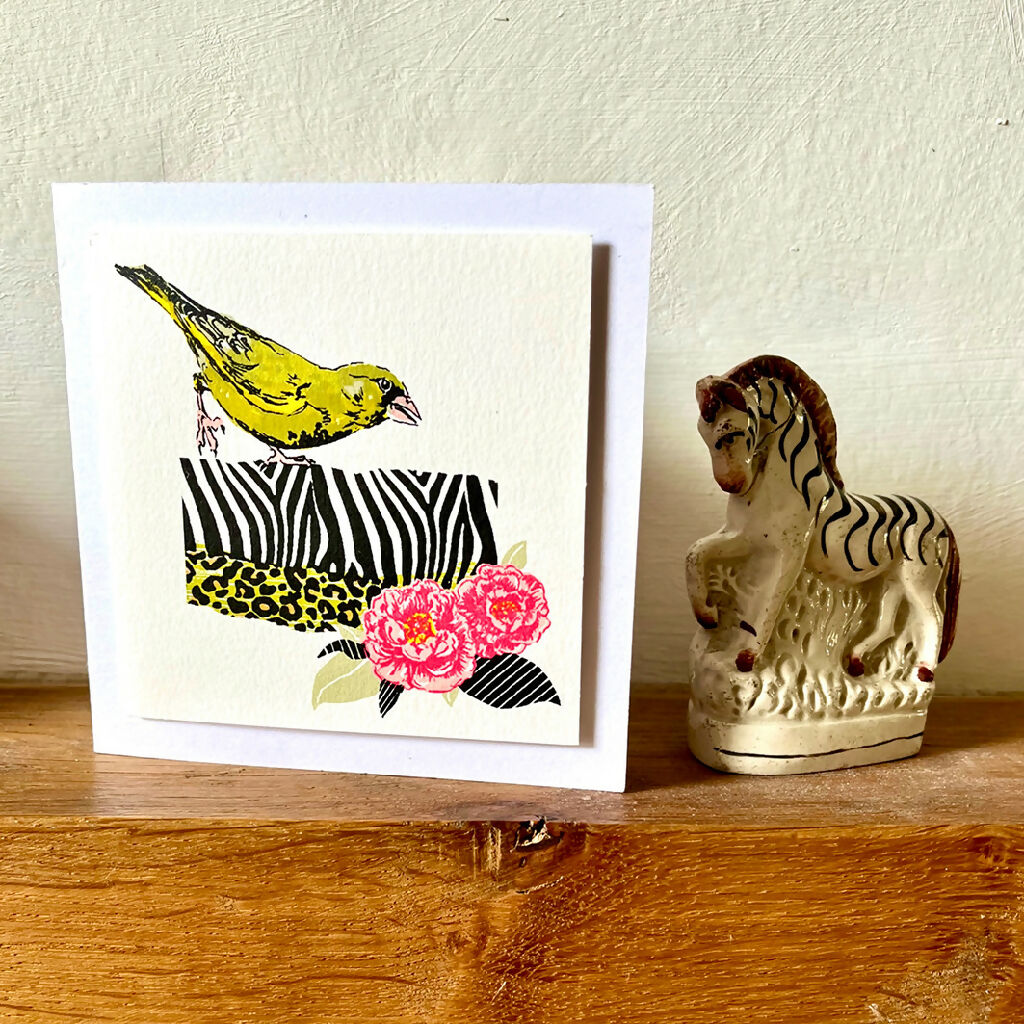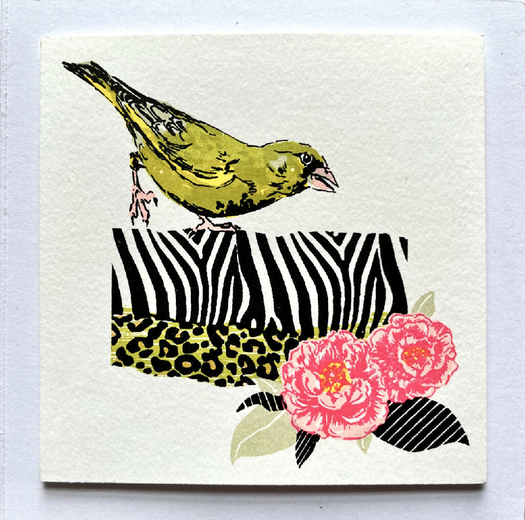 Hand screenprinted Greenfinch themed greetings card with 7 colours , including vibrant pink flowers. The design originated from a collage.