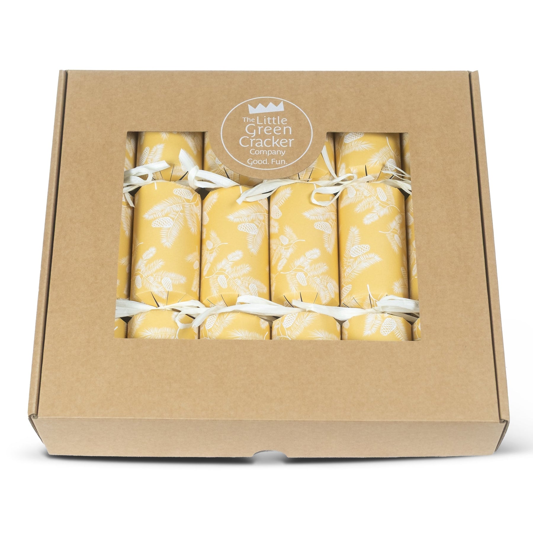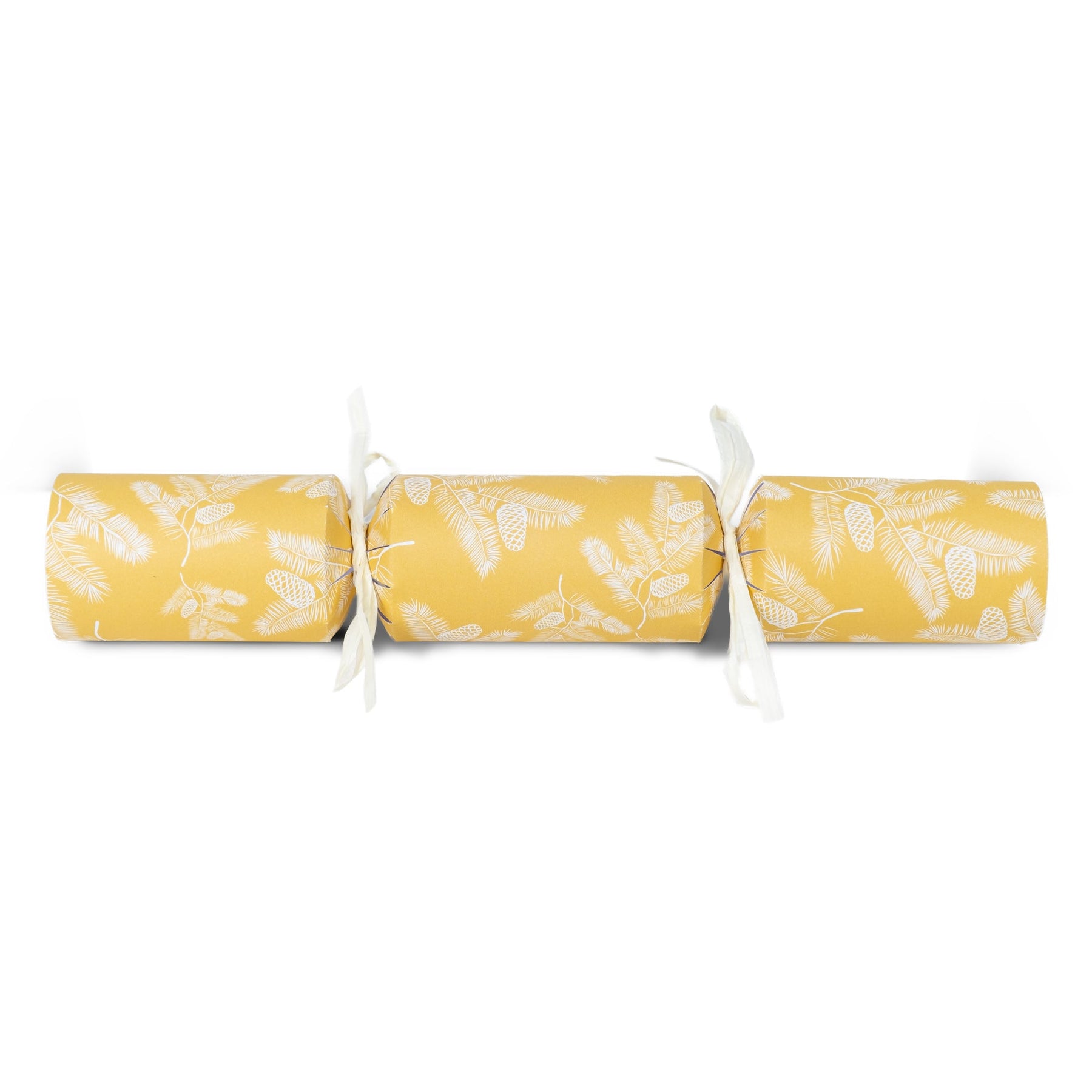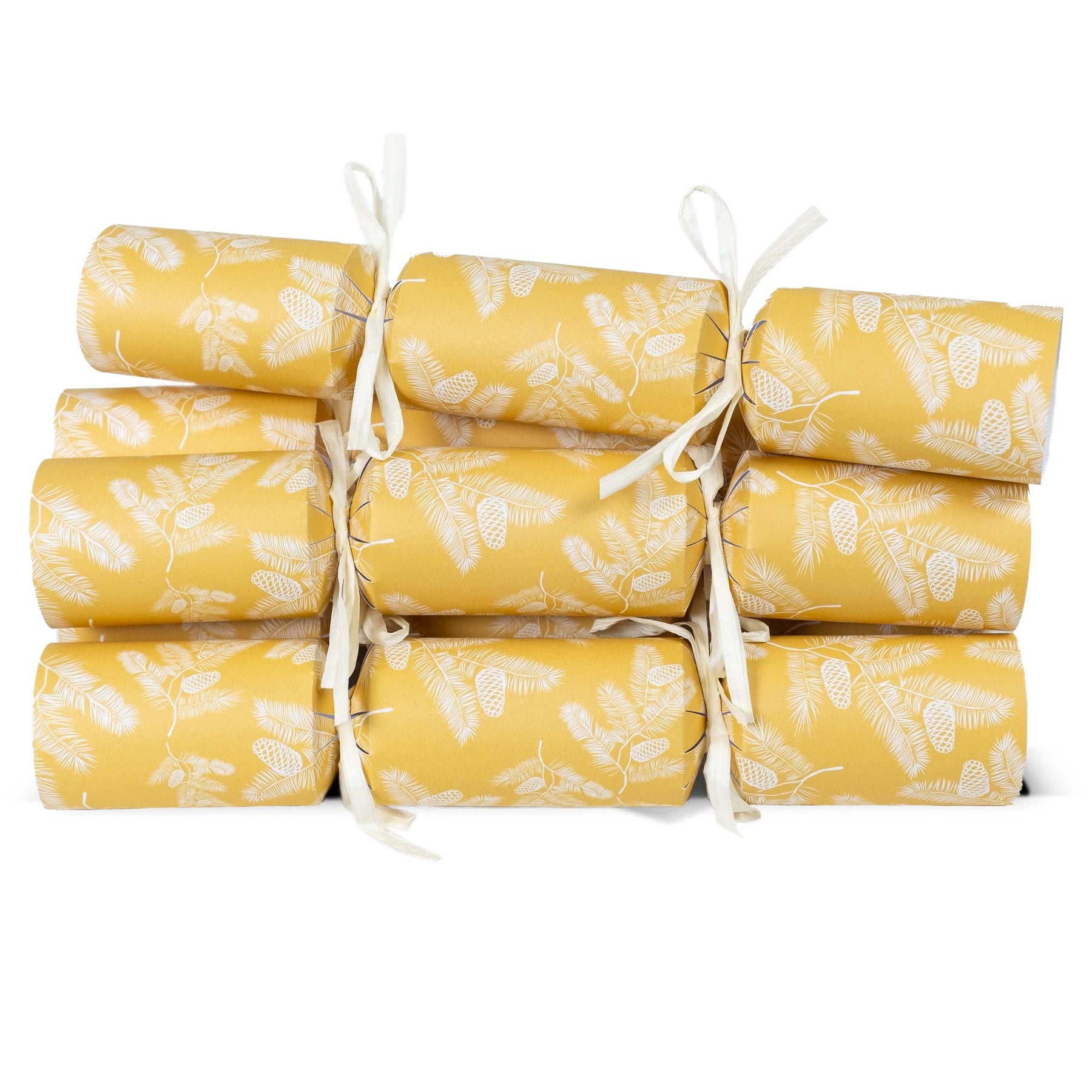 Six eco Christmas crackers with a fir cone pattern tied with a cream raffia ribbon.