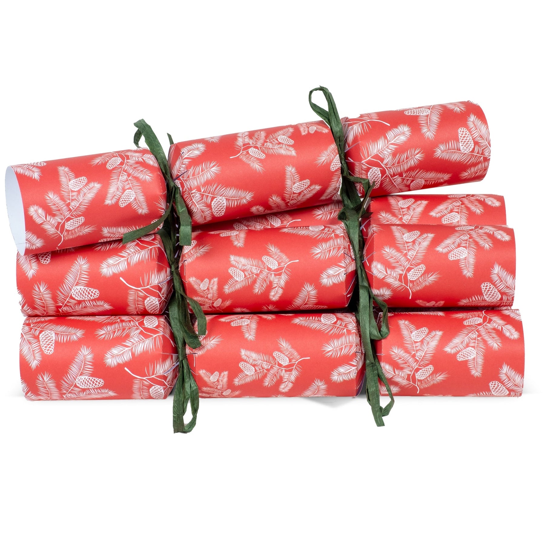 Six eco Christmas crackers printed in a crimson fir and pinecone design tied with raffia ribbons.Handmade, eco-friendly, and plastic free.One thing is for certain, eco doesn’t m...