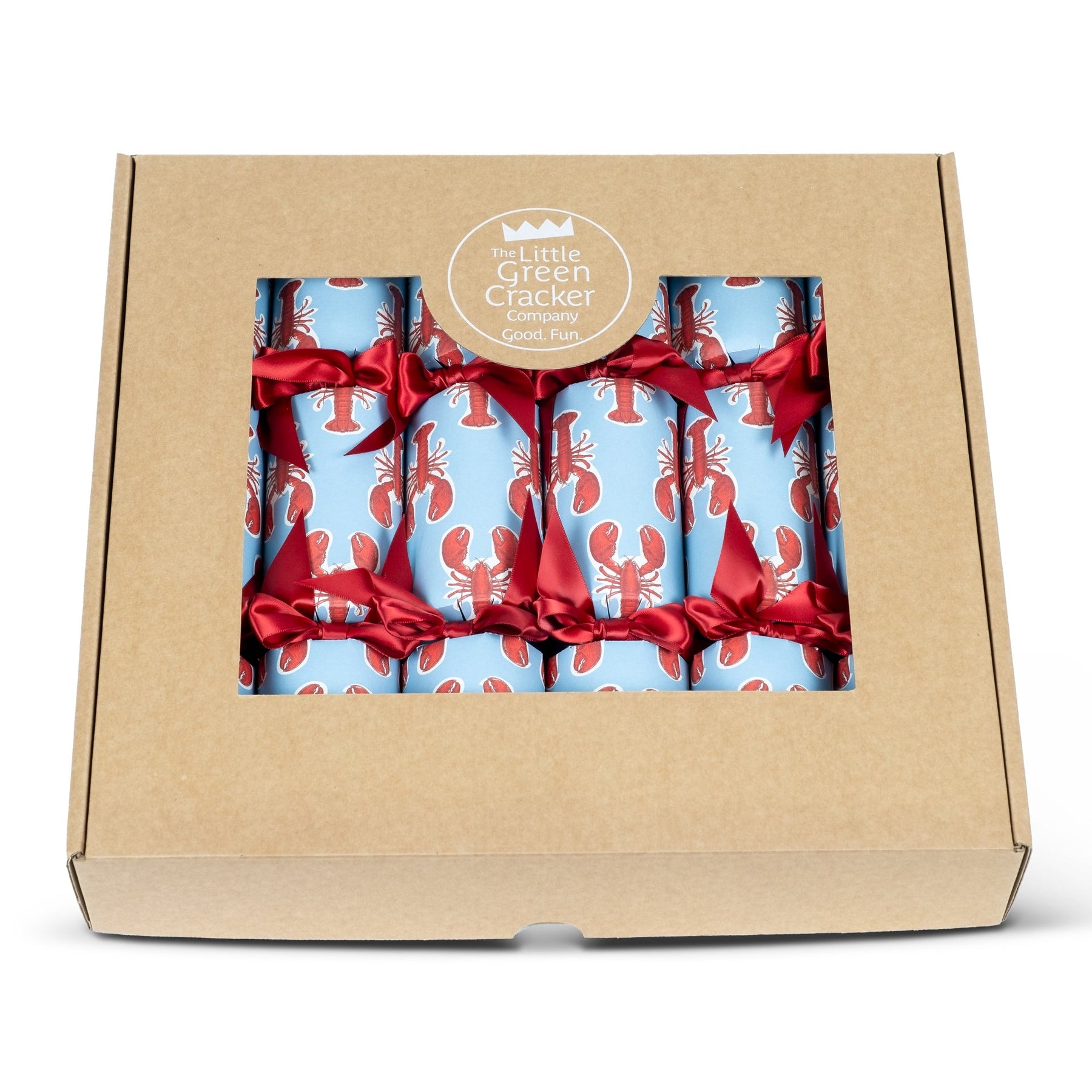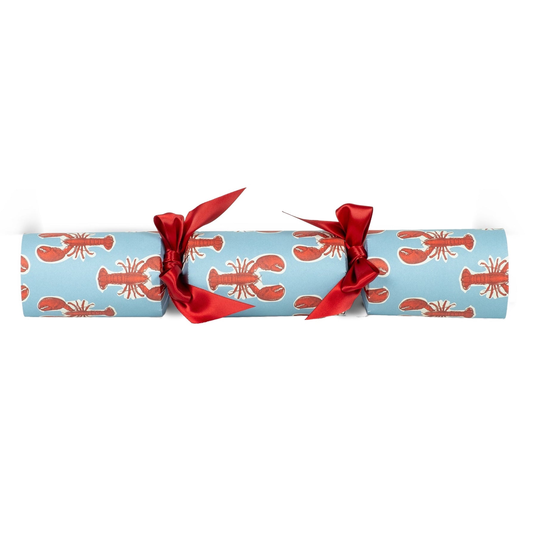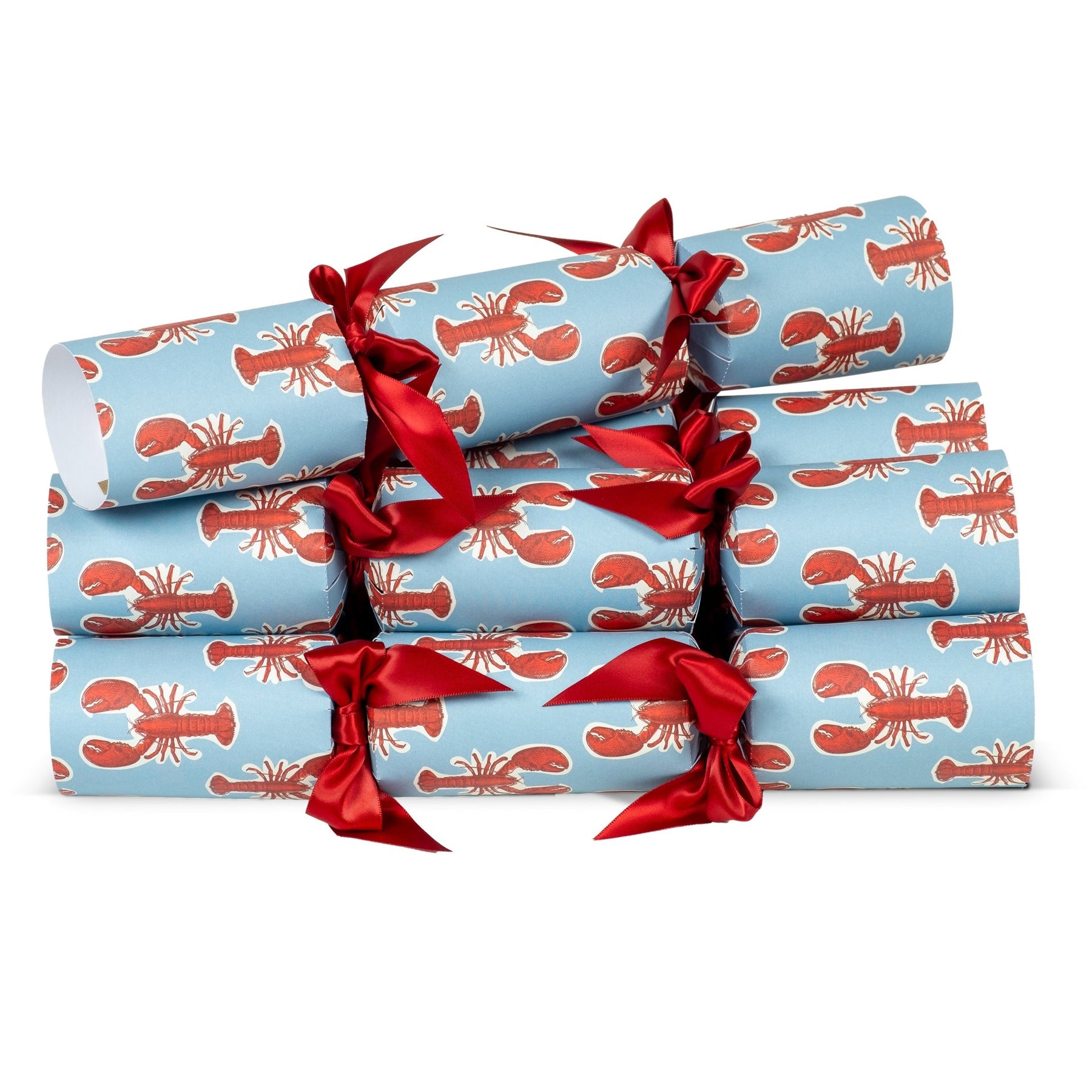 Six luxury Christmas crackers with a fun lobster design, matched with recycled polyester ribbon.