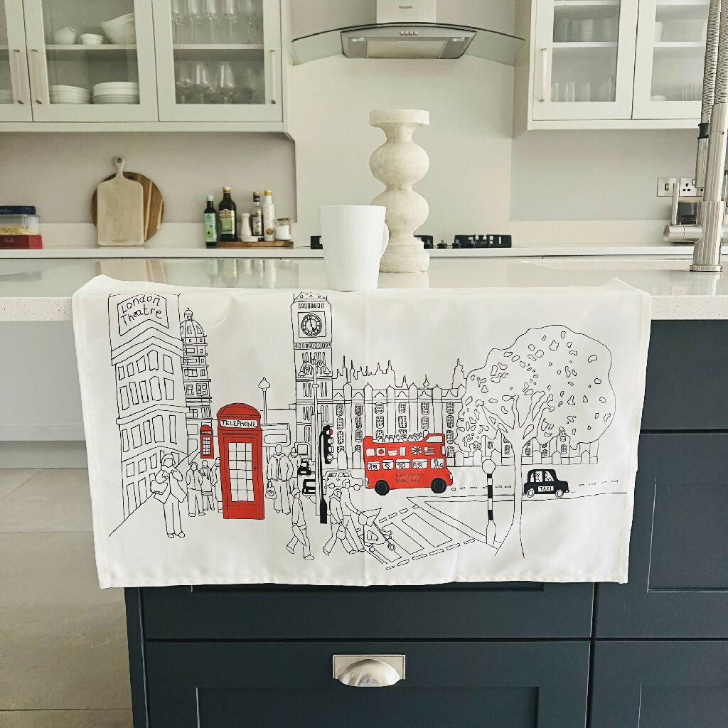 A eye catching organic cotton tea towel featuring Lottie’s hand drawn London Bridge design,