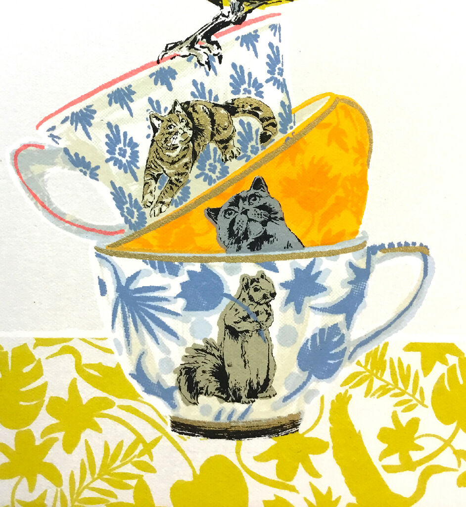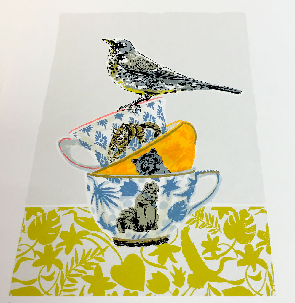 ‘Look Out’ is a limited edition 12 colour screen print on Fabriano paper. The background colour is a very pale silver and there is additional gold ink throughout the print.