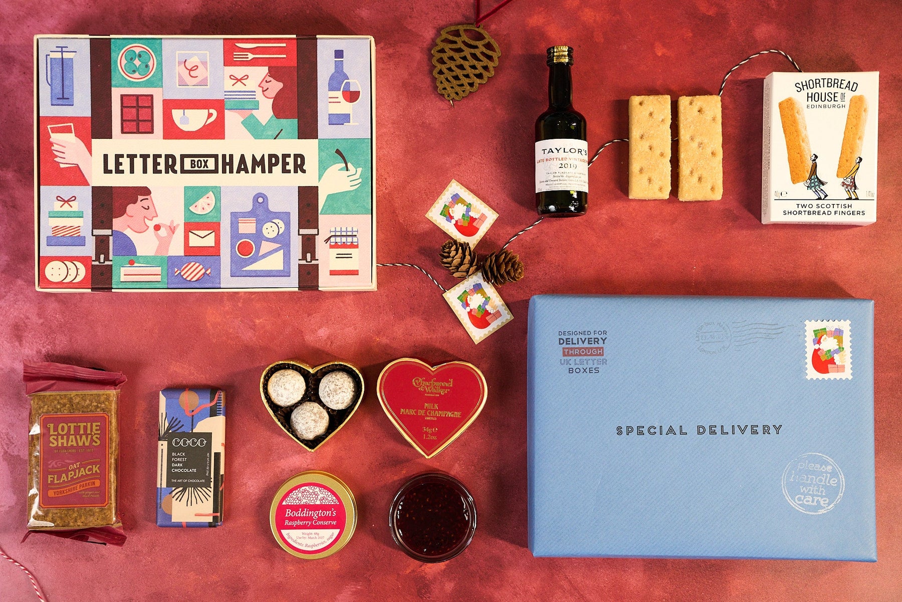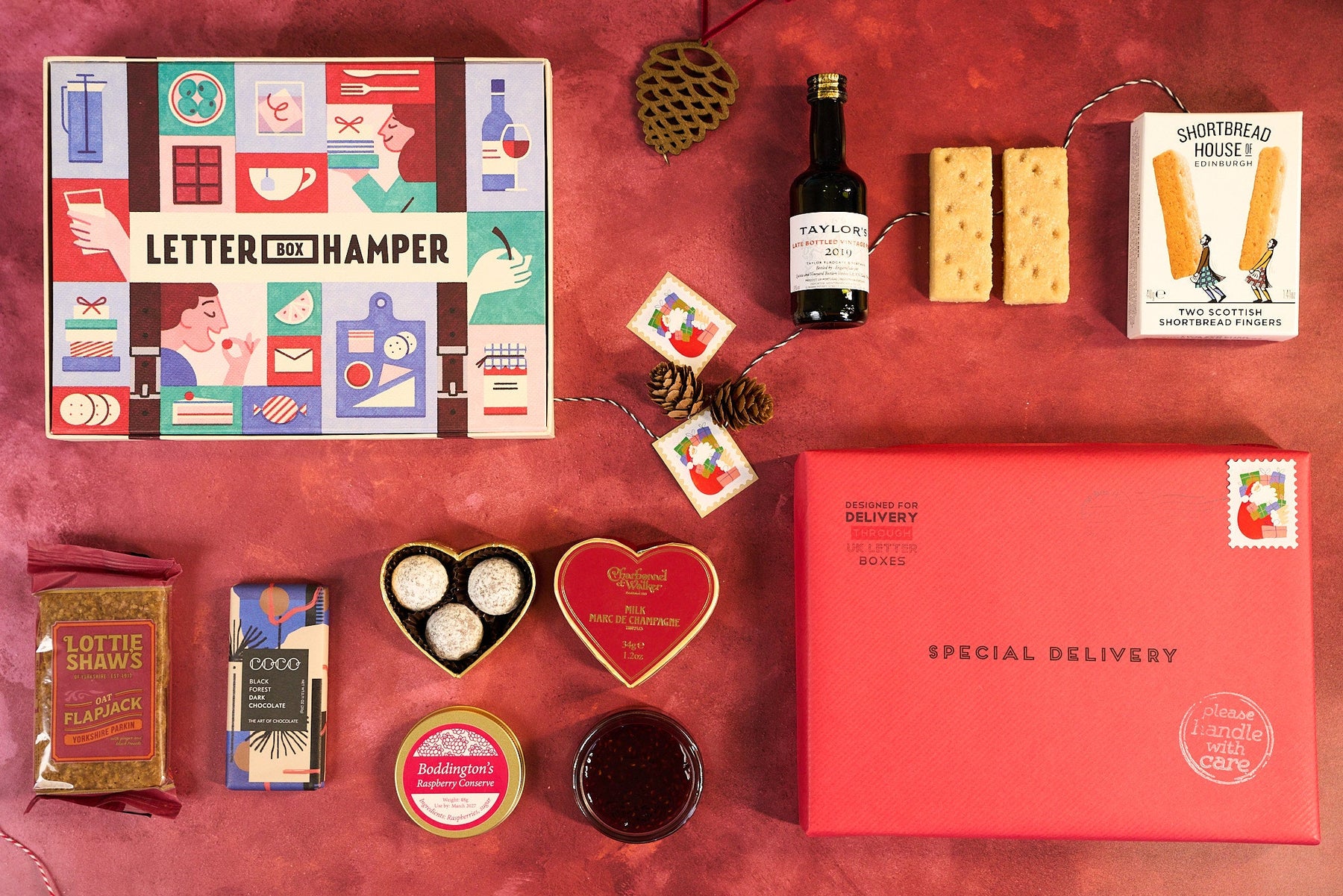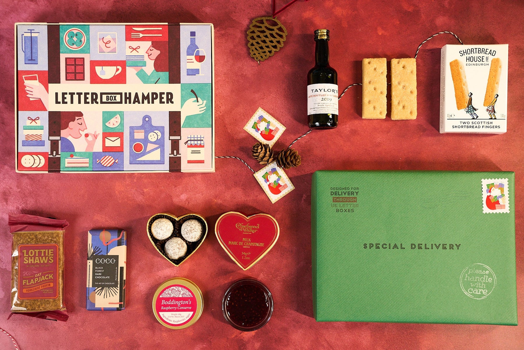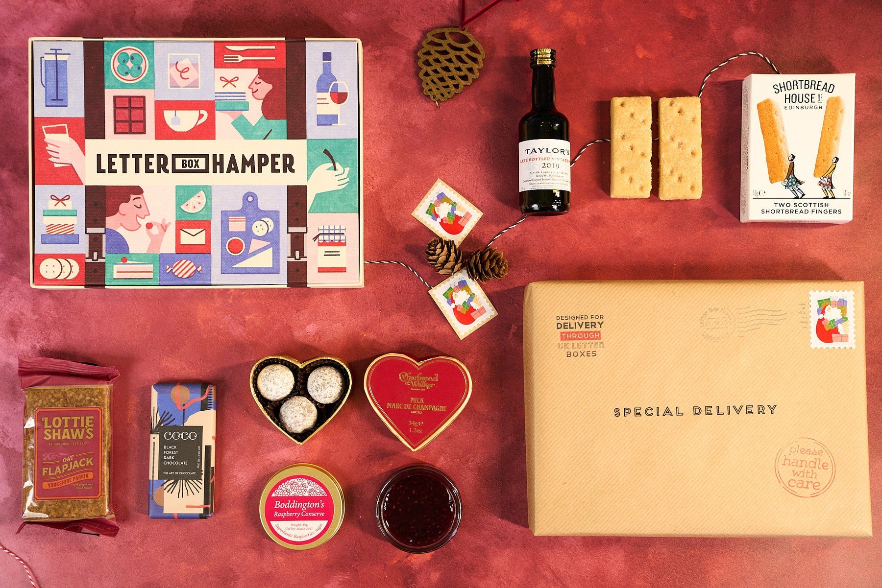 This special edition Christmas Letter Box Hamper includes Booja Booja luxury chocolate truffles, Scottish shortbread from the Shortbread House of Edinburgh, Cambrook's Roasted Festive Nuts and Taylors vintage port.