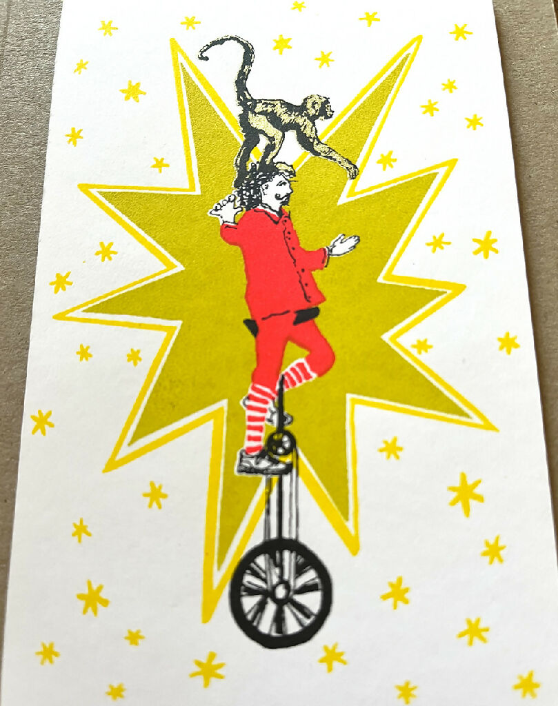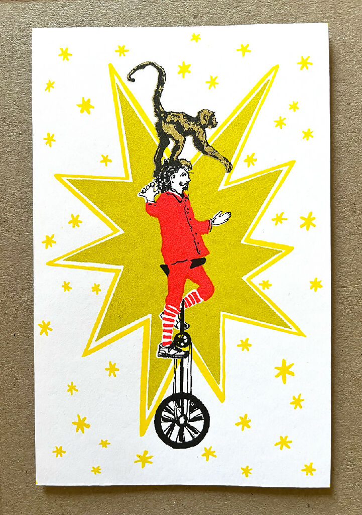 Hand screenprinted circus themed greetings card with 5 colours , including shiny gold featuring a monkey and unicyclist.. The card is a ‘mini print’ which is stuck on to a recycled Kraft card back. The print is slightly raised from the card backing.