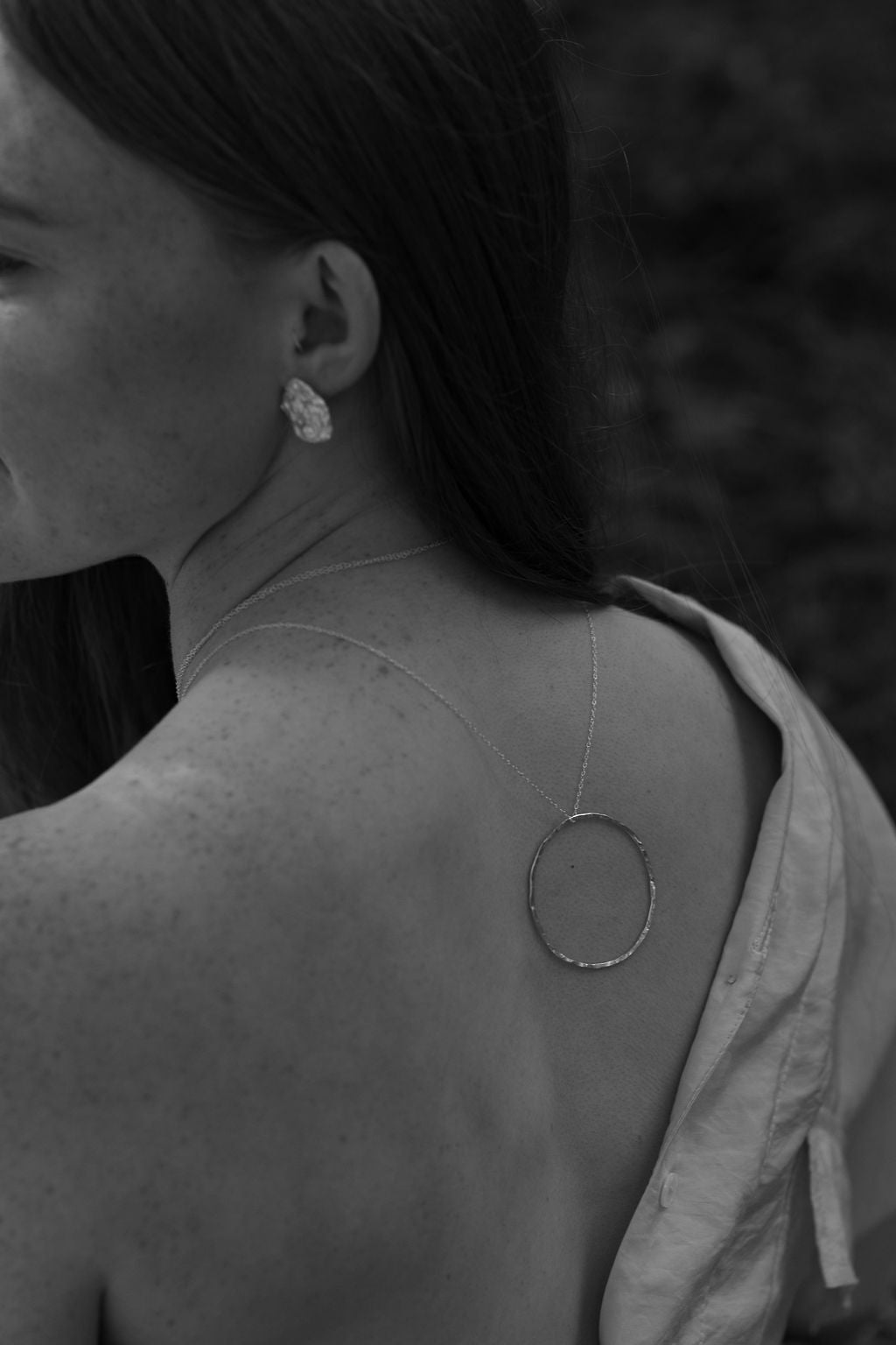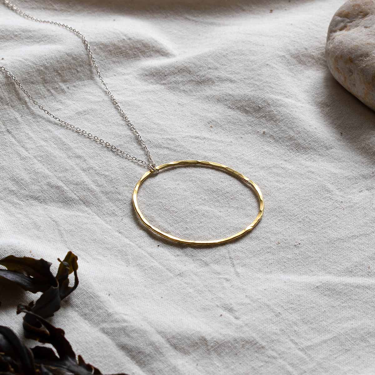 This hand battered Moon pendant is made with brass and comes with a recycled silver chain.