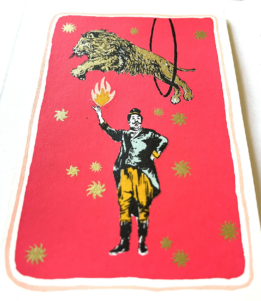 Hand screenprinted circus themed greetings card with 6 colours , including shiny gold and a vibrant raspberry pink background. The card is a ‘mini print’ which is stuck on to a recycled card back. The print is slightly raised from the card backing.