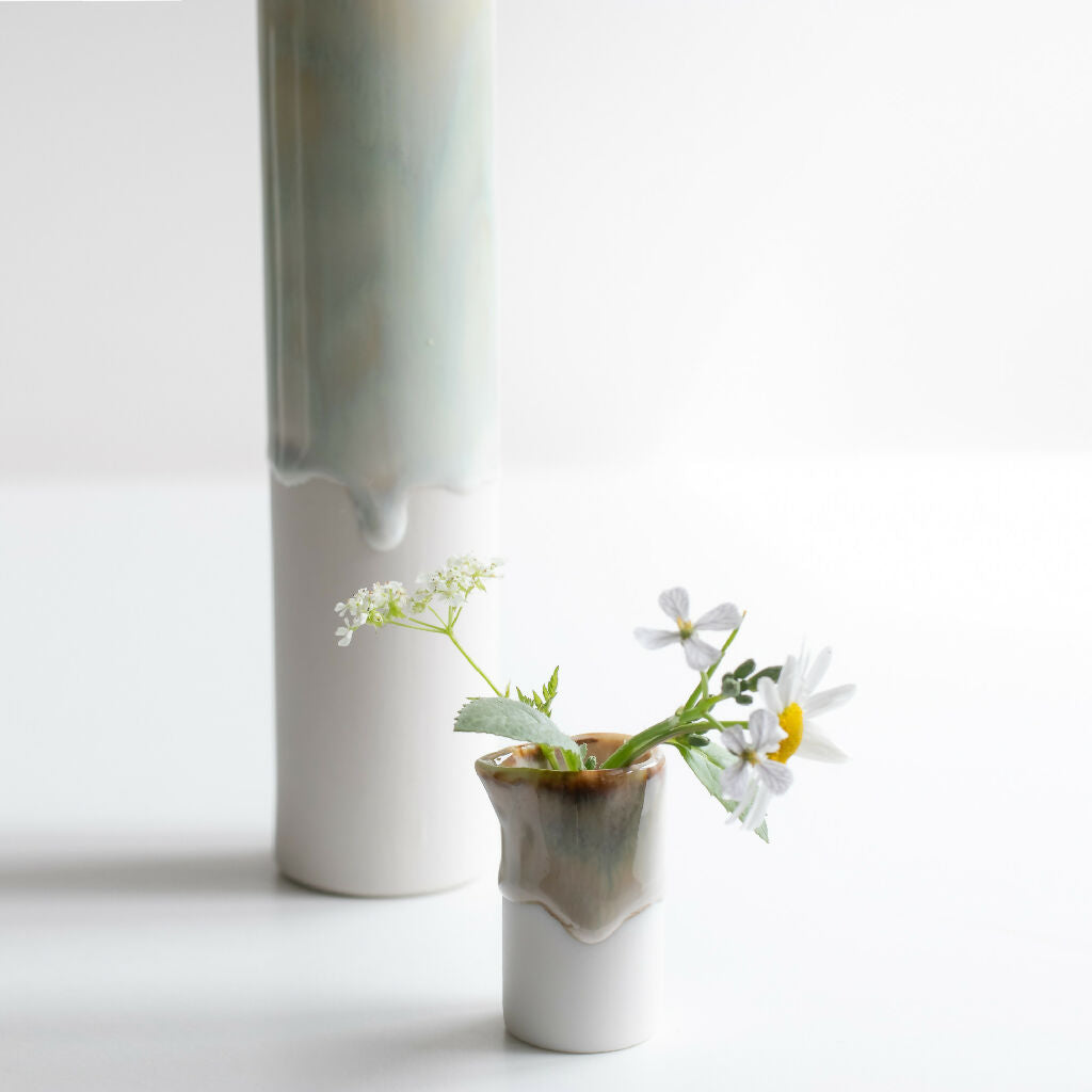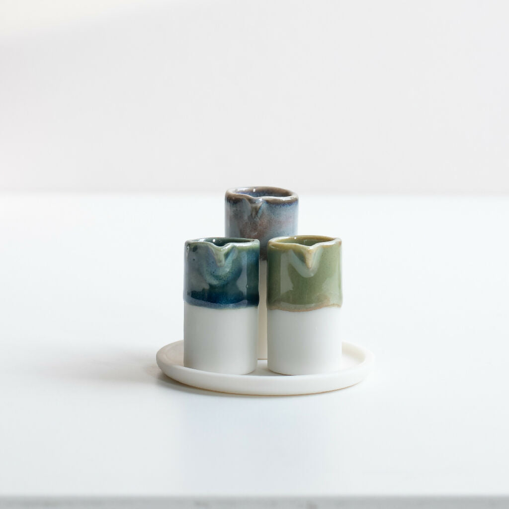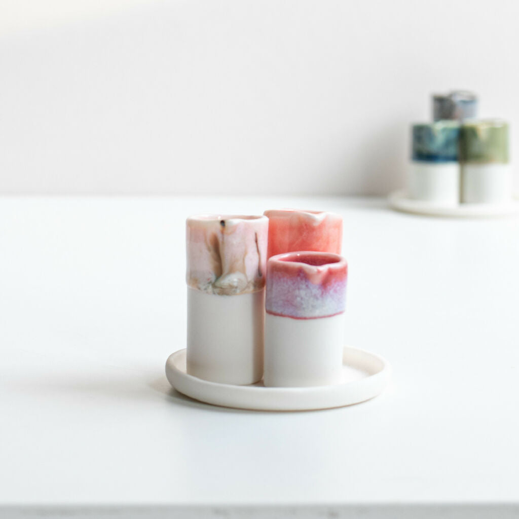 A set of 3 miniature vases in porcelain, each with a rim of richly coloured glaze. The glazes are layered and combined to give varied effects and fall gently over the tactile porcelain clay.
