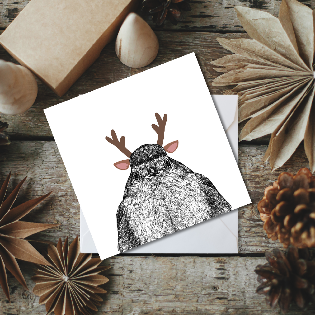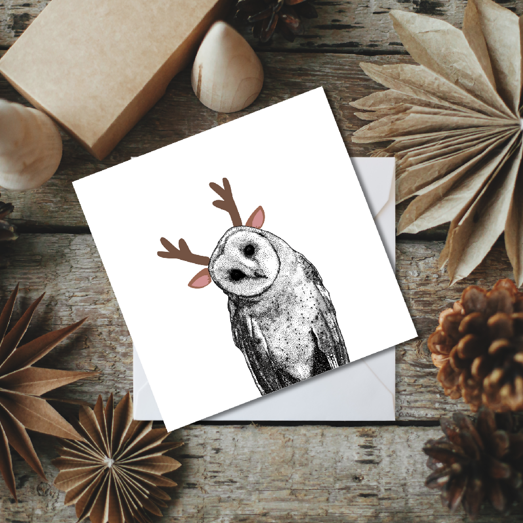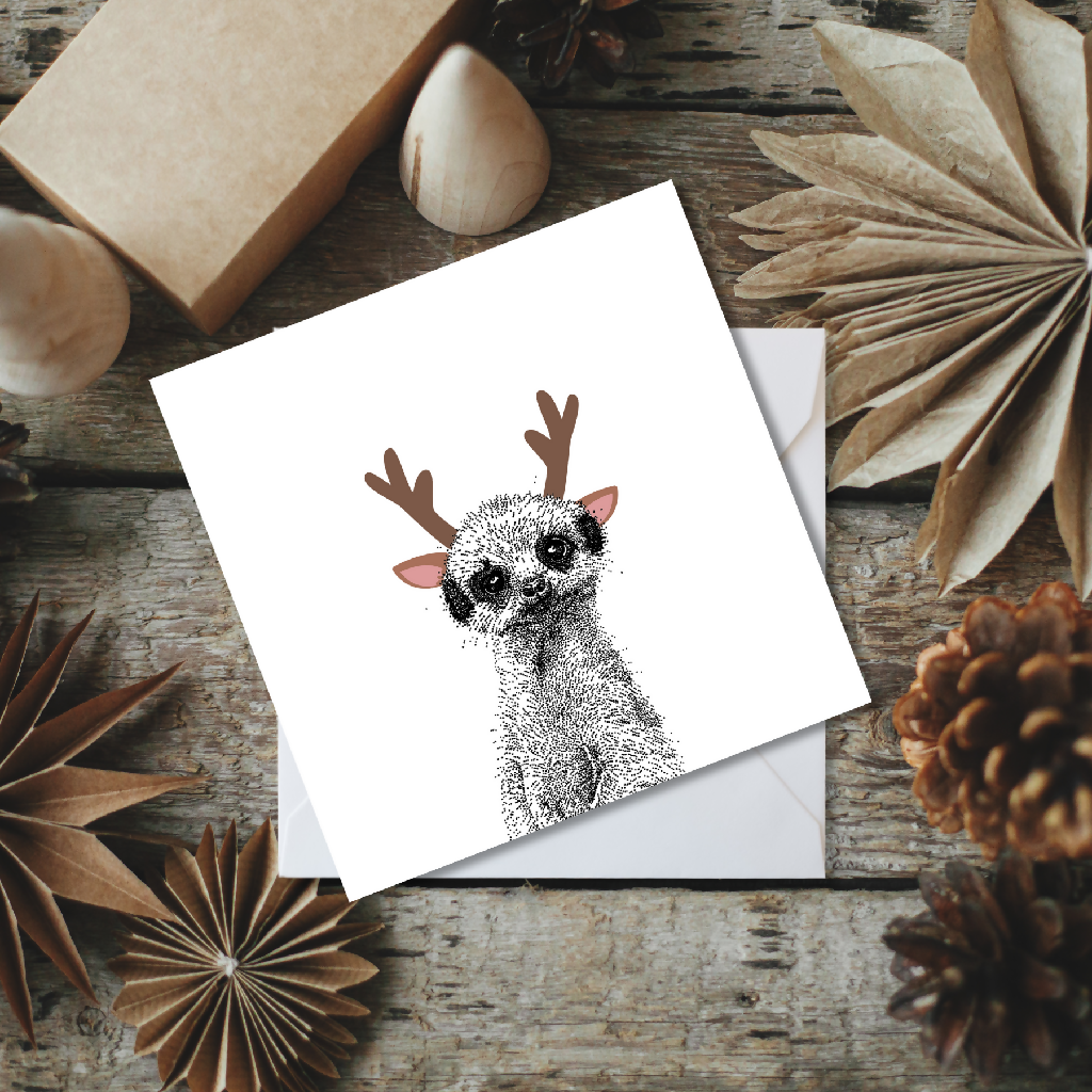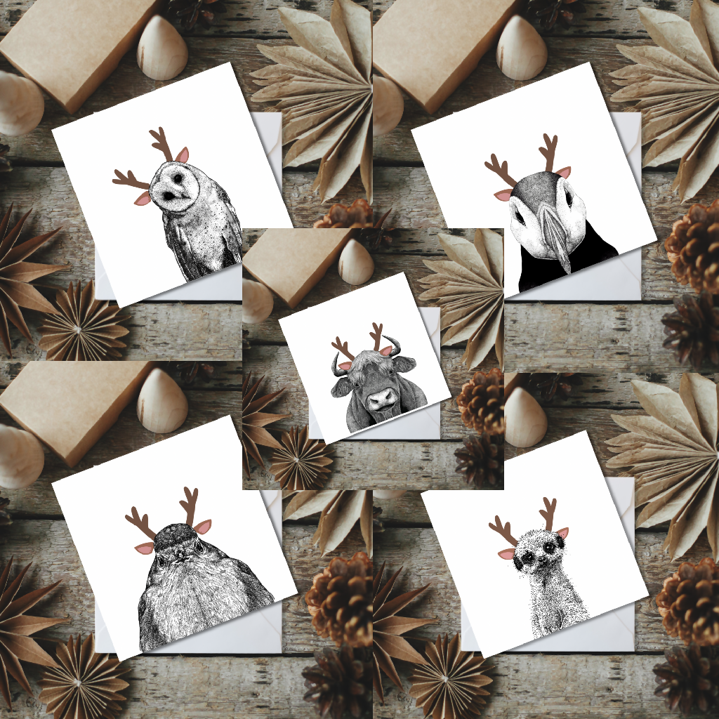 Bring a sprinkle of festive magic to your holiday season with our charming Reindeer Animal Greeting Cards. This delightful collection features five much-loved creatures—owl, cow, puffin, meerkat, and robin—each illustrated in elegant black and white dotwork and topped with playful brown reindeer antlers. Perfect for anyone who loves quirky, nature-inspired artwork with a touch of Christmas cheer.