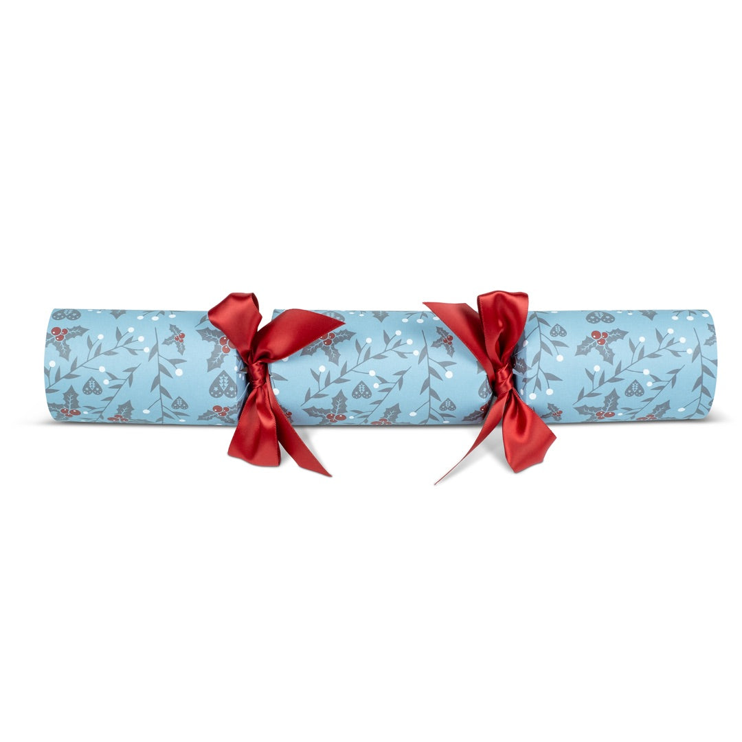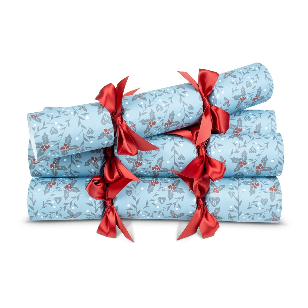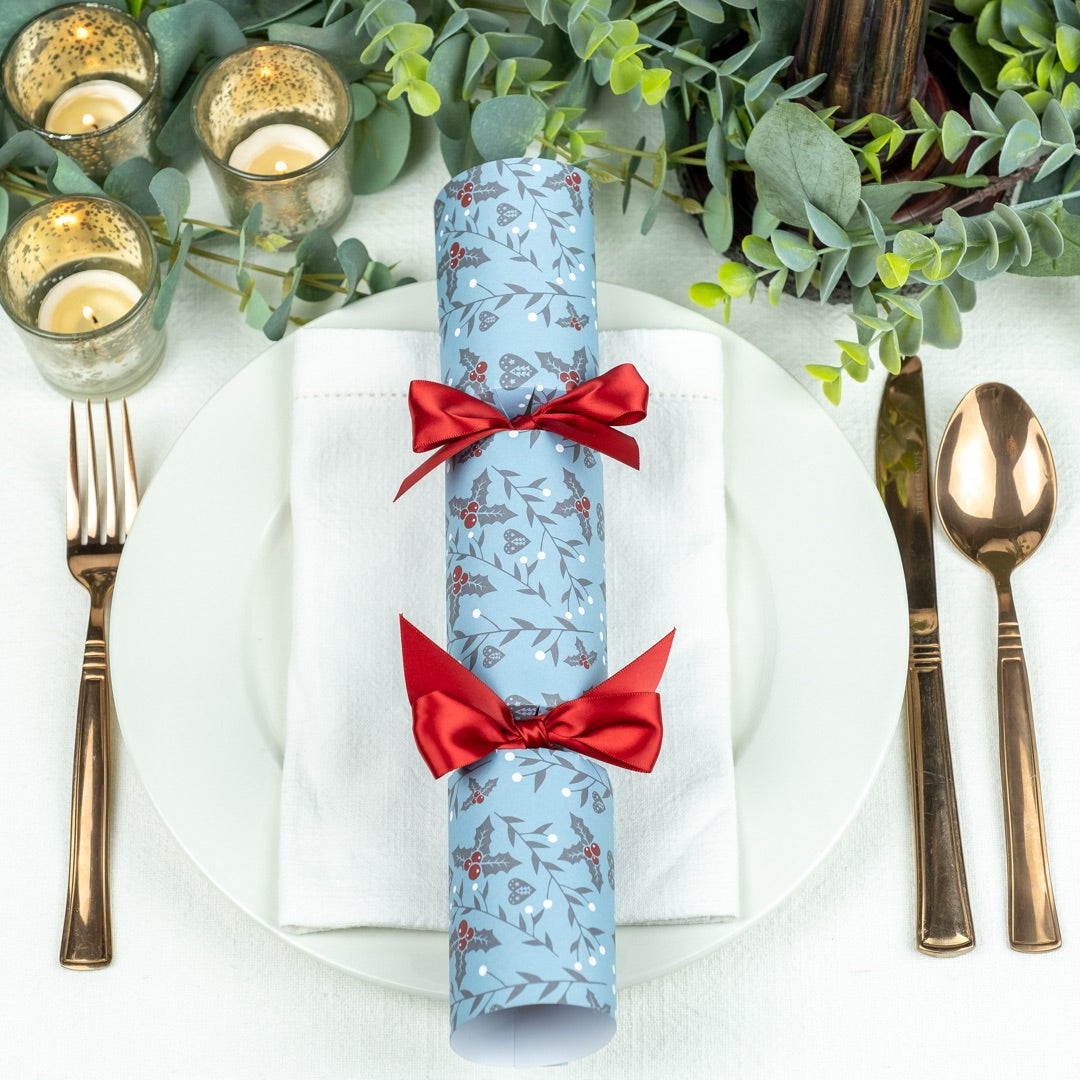 Six luxury Christmas crackers with a blue Scandi design, with holly and mistletoe imagery, tied with eye-catching pillar-box red recycled plastic bottle ribbon.