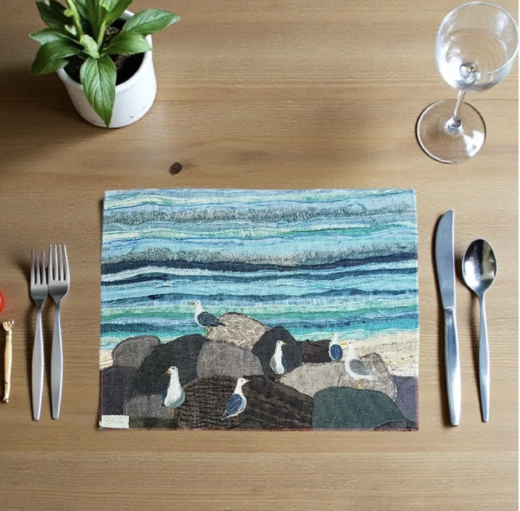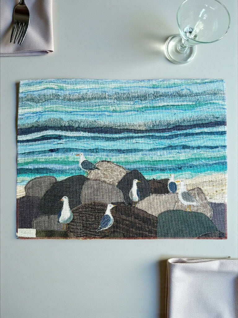 A beautiful pure linen placemat featuring a seascape and a flock of pesky seagulls! A wonderful coastal addition to any dining table. These are double layered premium linen, washable mats with the most beautiful natural weave.