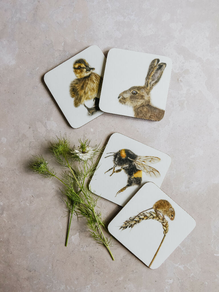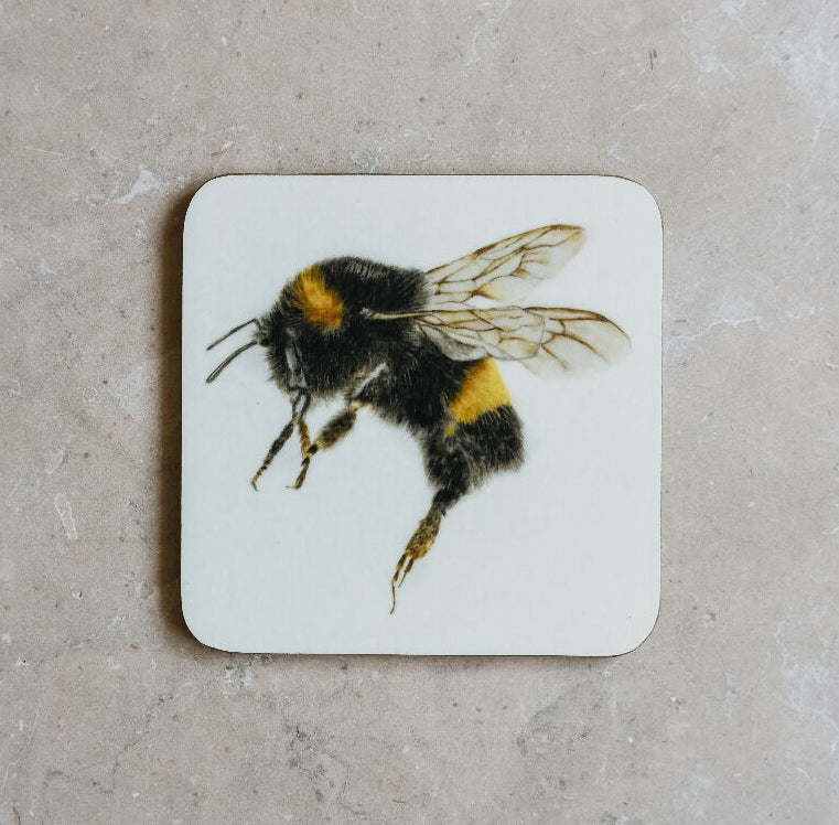 Featuring 4 of Rachel’s delicate pencil drawing of a bumblebee, our heat resistant coasters are made from satin finish melamine with an attractive and durable cork base.