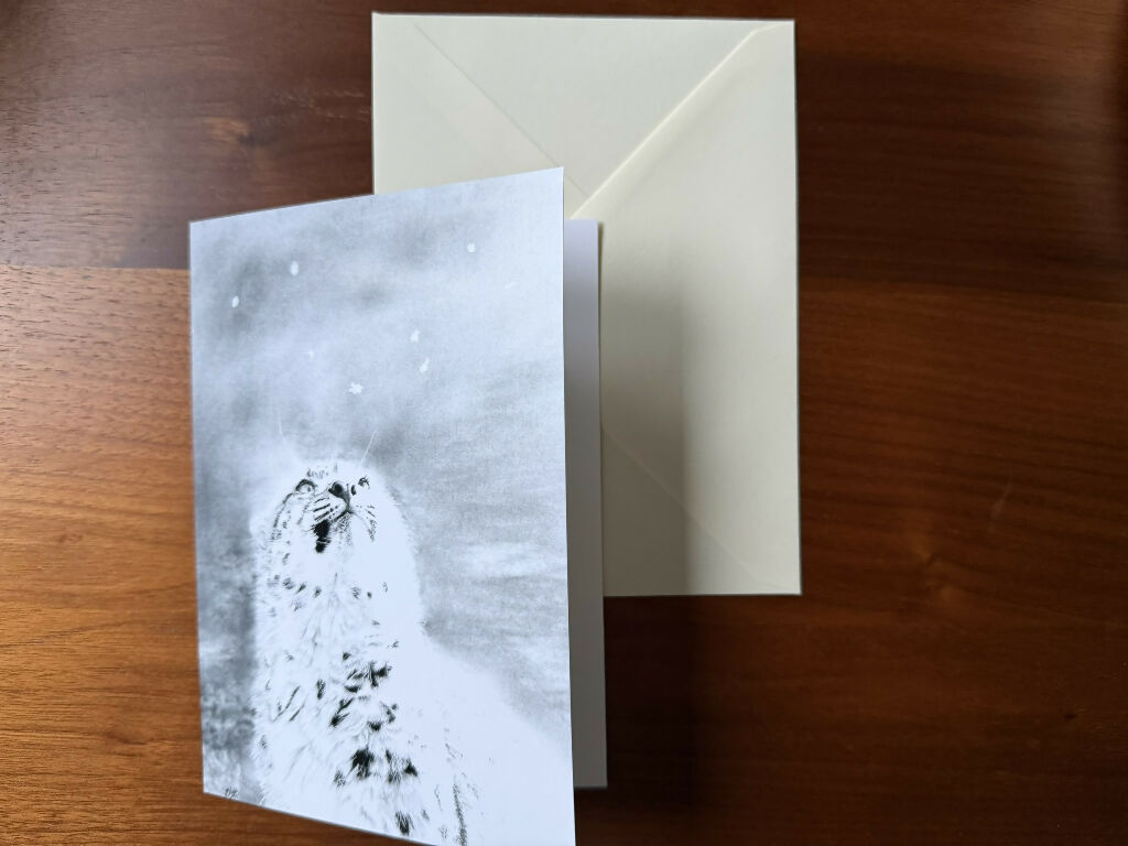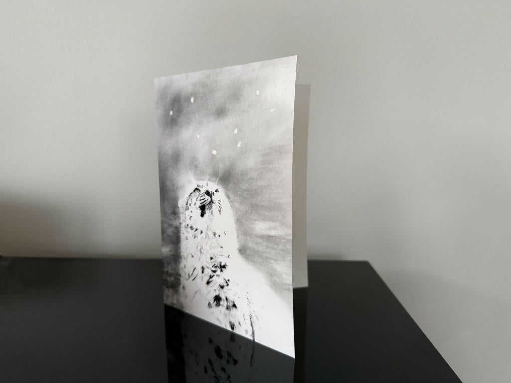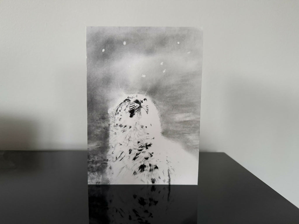 A captivating Christmas card featuring a snow leopard cub entranced by its first snowfall. In portrait orientation, printed from my original artwork on FSC-certified smooth whi...
