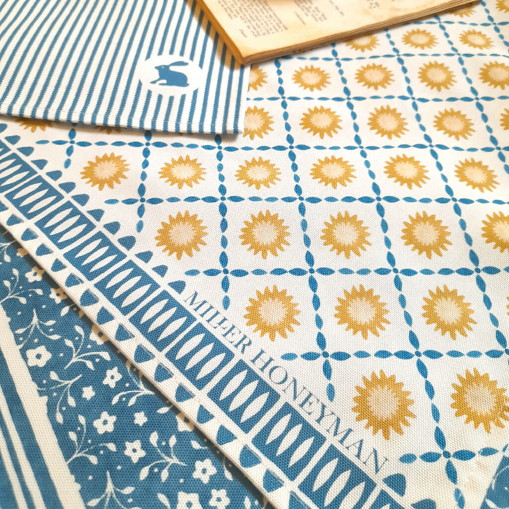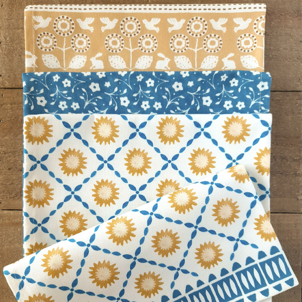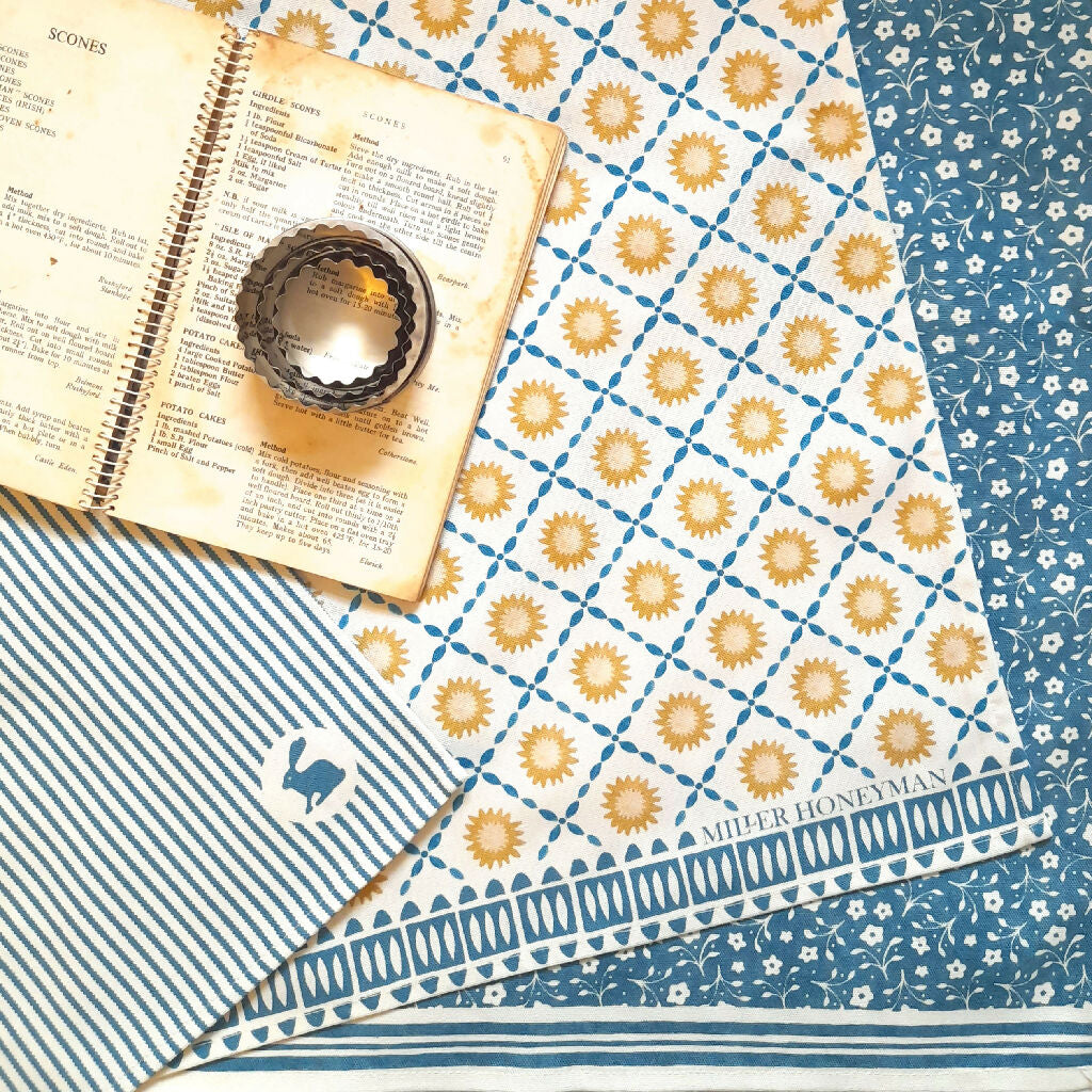 This organic cotton tea towel features my Sunburst design in blue, perfect for a country cottage look. The tea towel has a handy corner hanging loop.