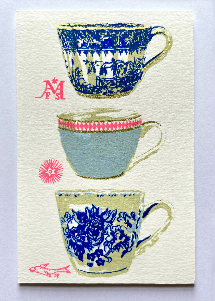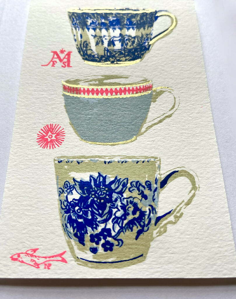 Hand screenprinted Teacup themed greetings card with 5 colours , including shiny gold and a vibrant pink depicting the china ‘makers’ marks. The card is a ‘mini print’ which is stuck on to a recycled card back. The print is slightly raised from the card backing.