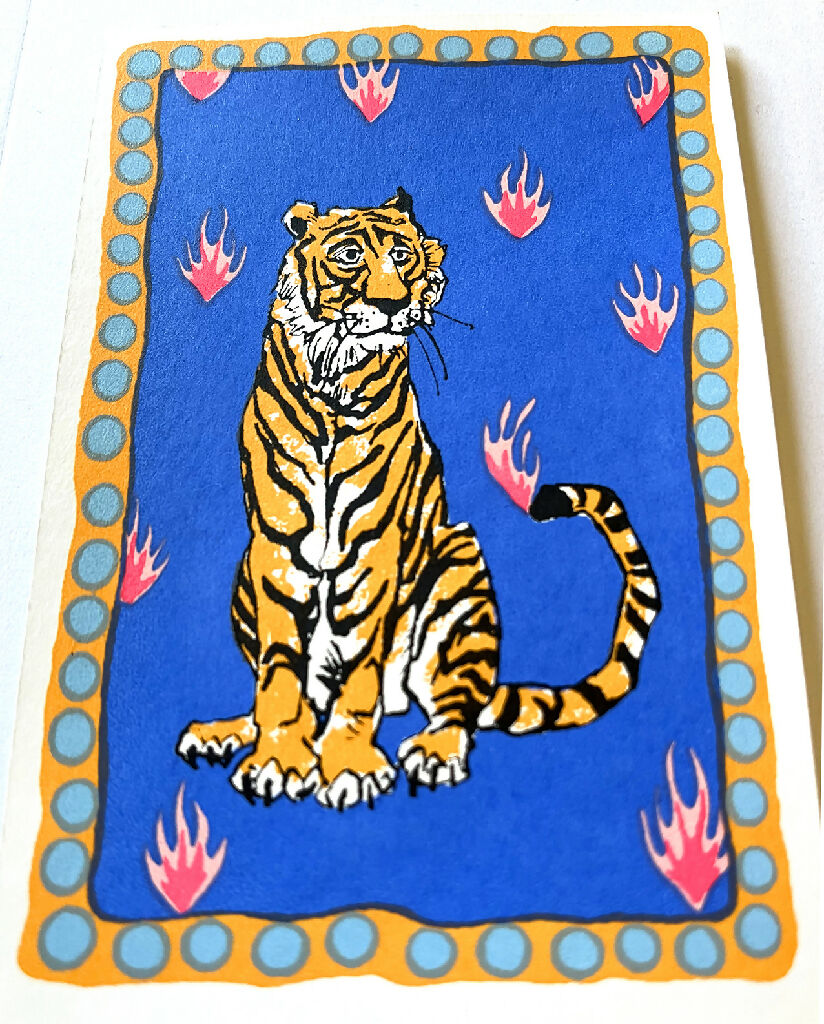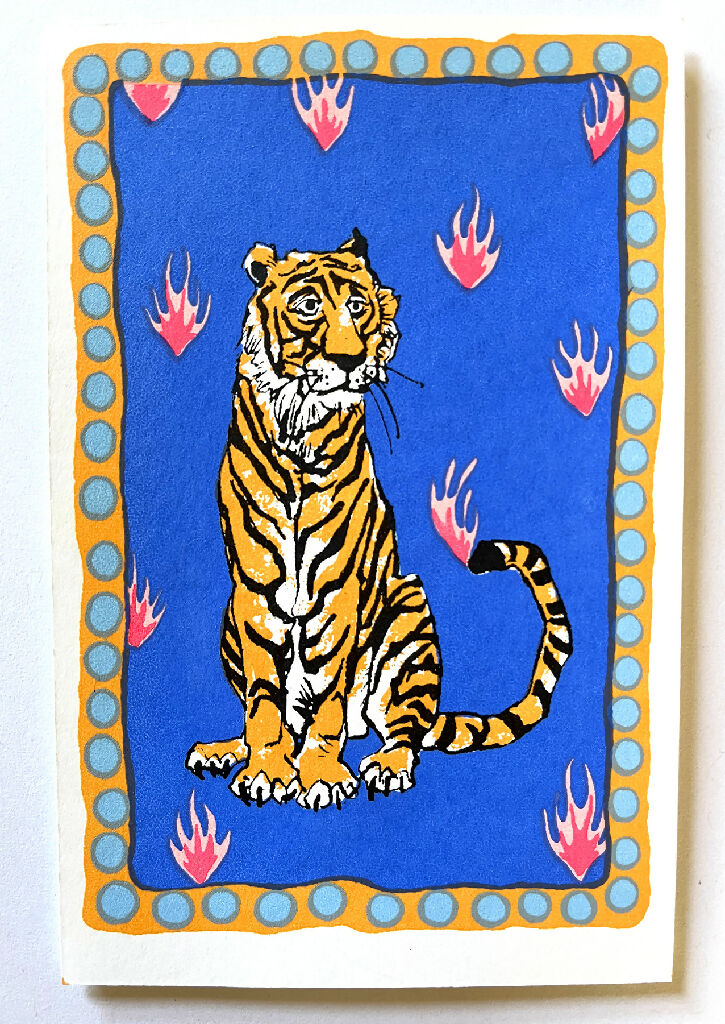 Hand screenprinted circus themed greetings card with 6 colours featuring a wistful Tiger on a vibrant blue background. The card is a ‘mini print’ which is stuck on to a recycled card back. The print is slightly raised from the card backing.