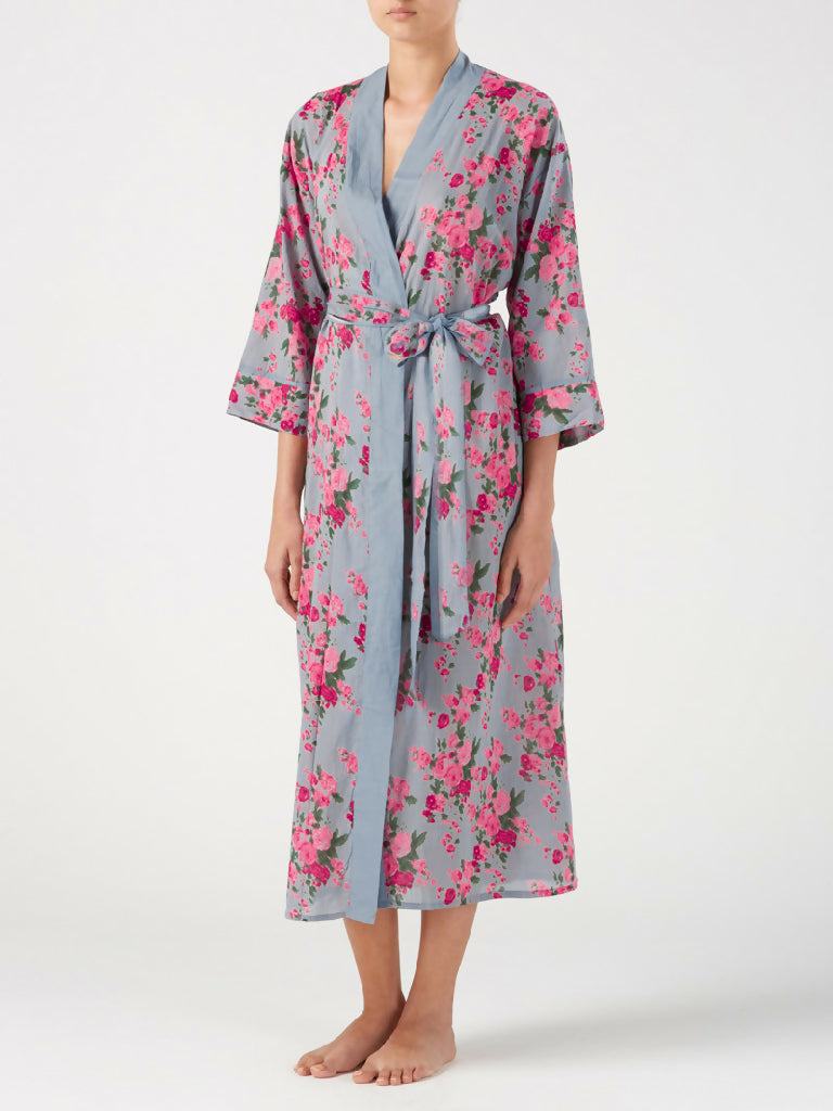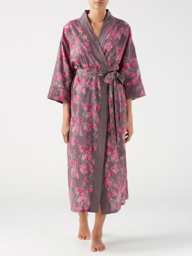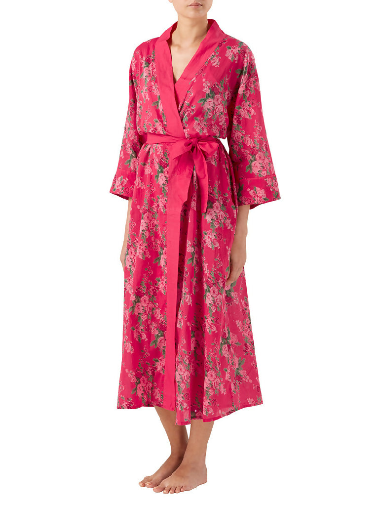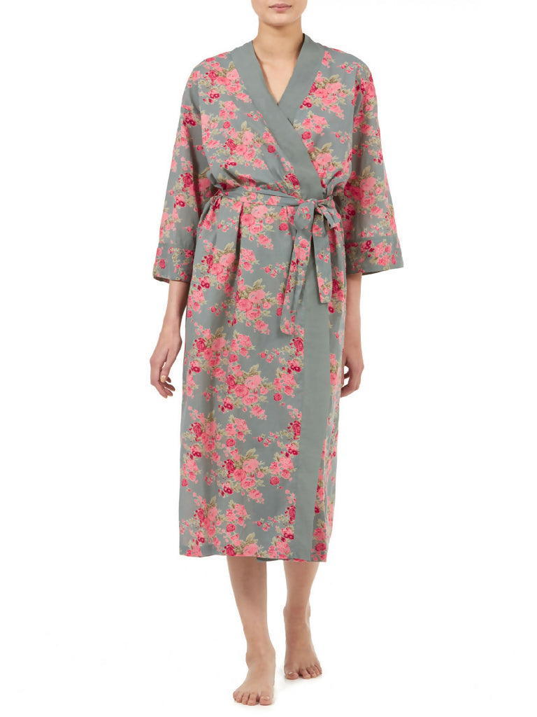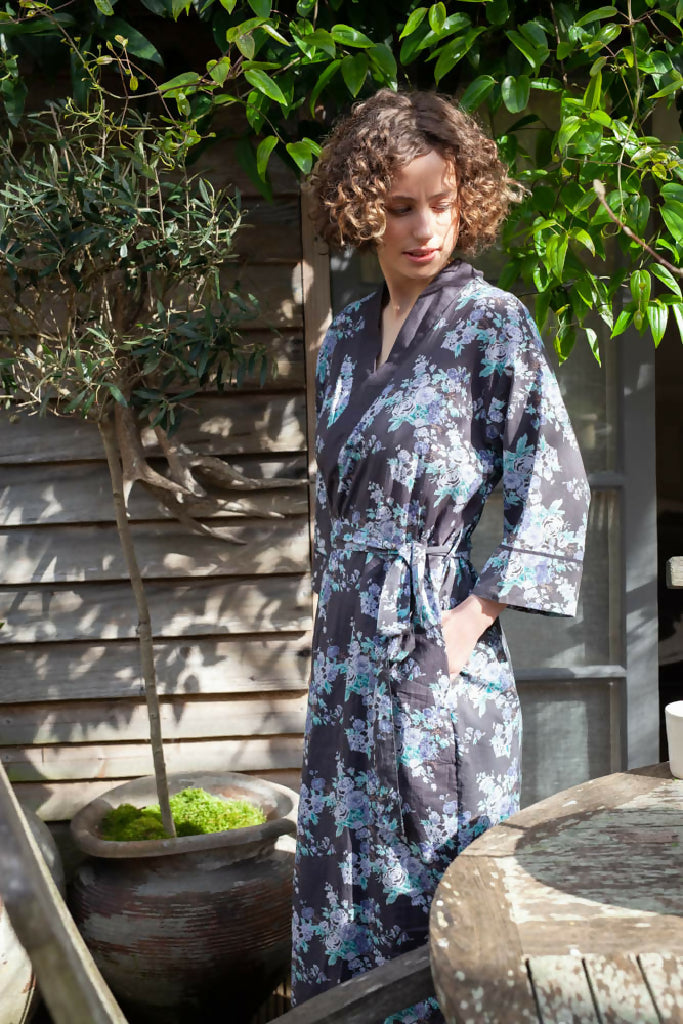 Long kimono-style dressing gown in this season’s new printed softest Indian cotton, in Rambling Rose print. Generously cut with a tie belt and 2 hidden pockets in the side seams. Due to popular demand, we’ve made a larger size in our bestselling Kimono Robe to fit a size 16+. It is exactly the same design, but much more roomy. Length 128cm. Machine wash at 40 degrees. 100% Cotton. In sizes: 8-16 and 16-22.