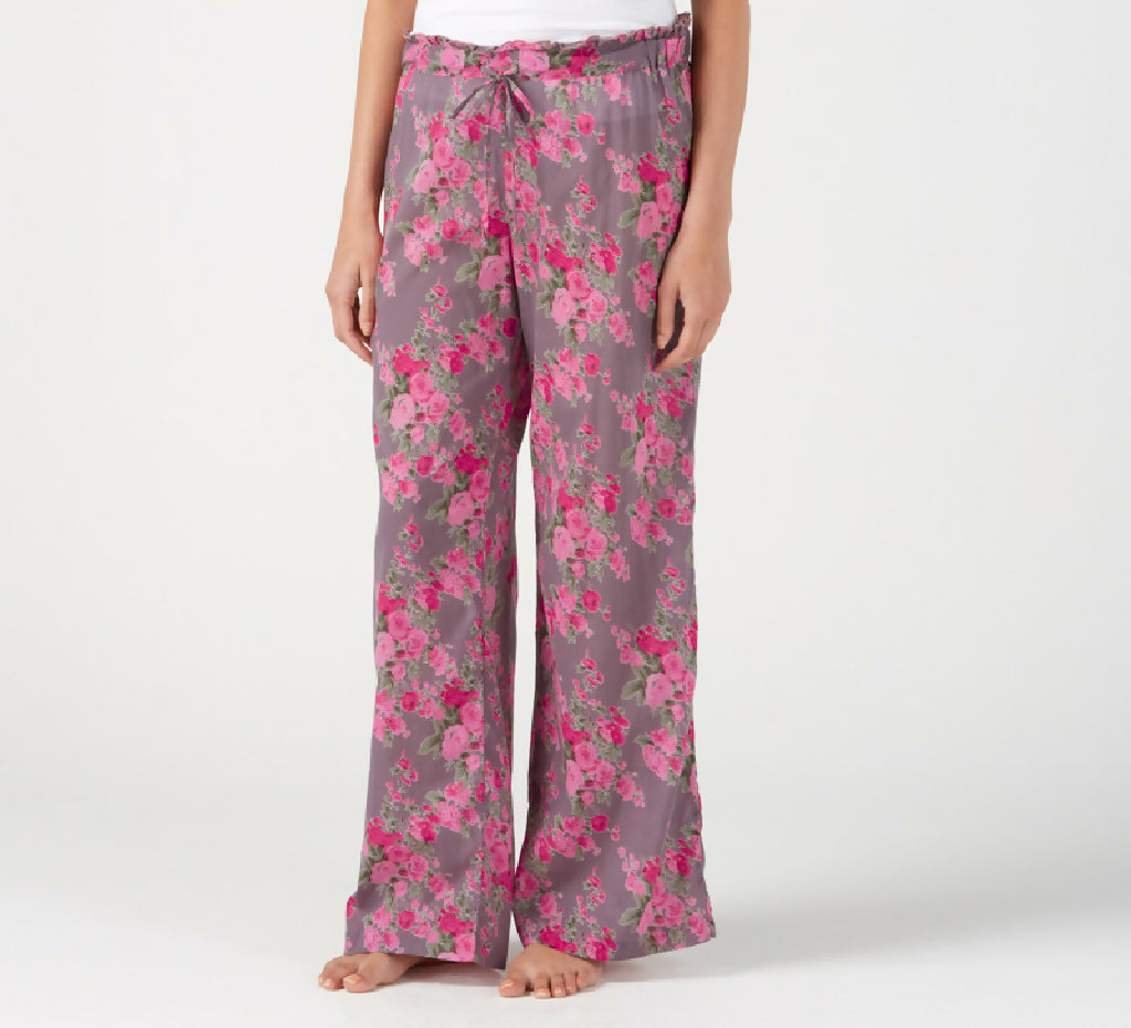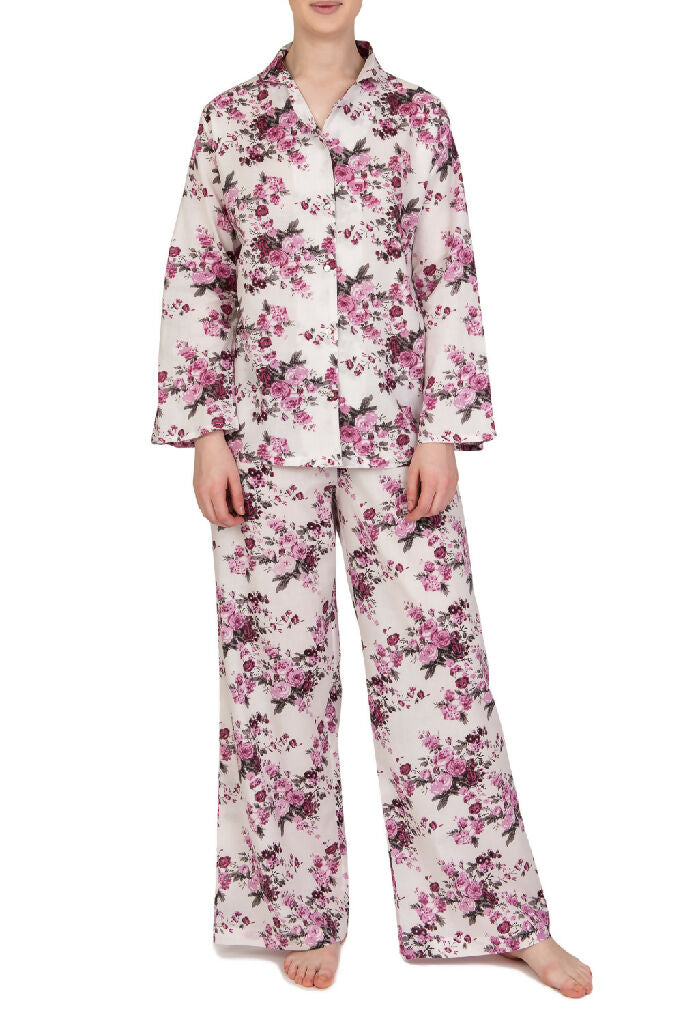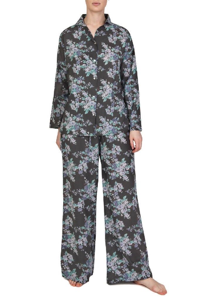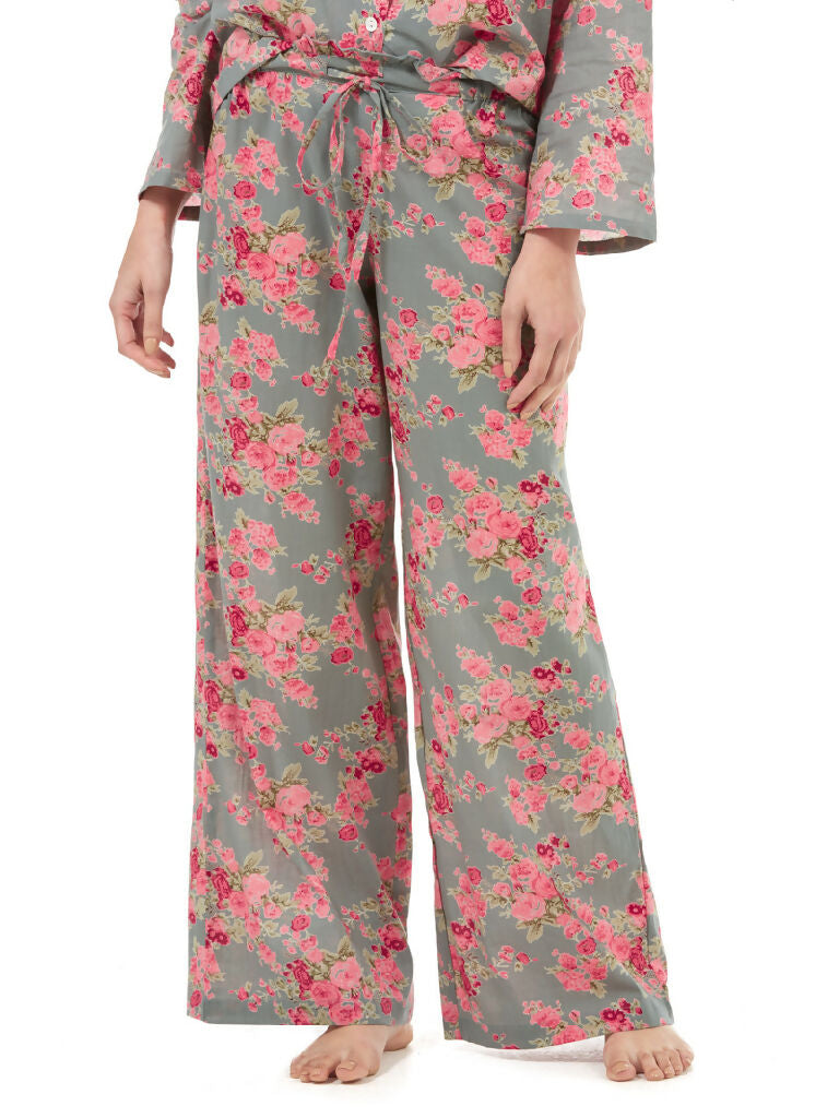 Loose and easy cotton pyjamas in our soft printed cotton voile, Vintage Rose print. Generously cut, the bottoms have an elastic and drawstring waist with frill detail. The top is simple and loose with buttons.