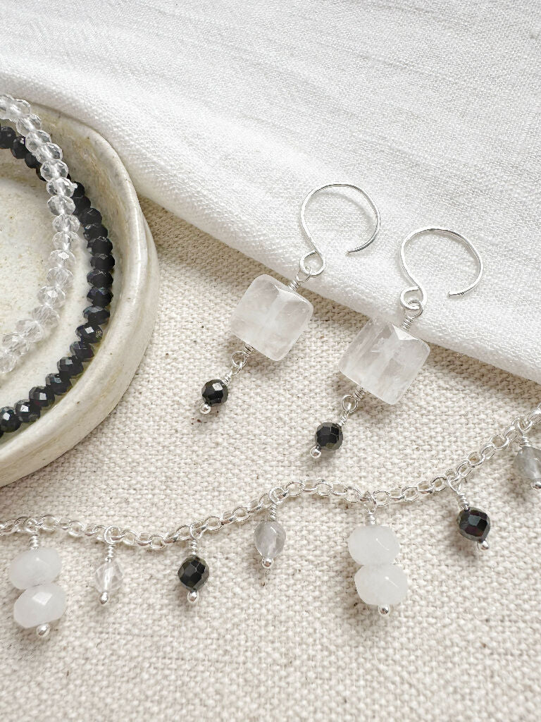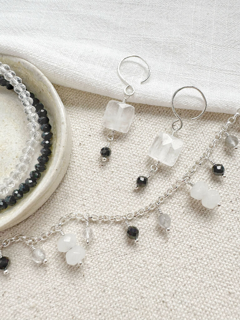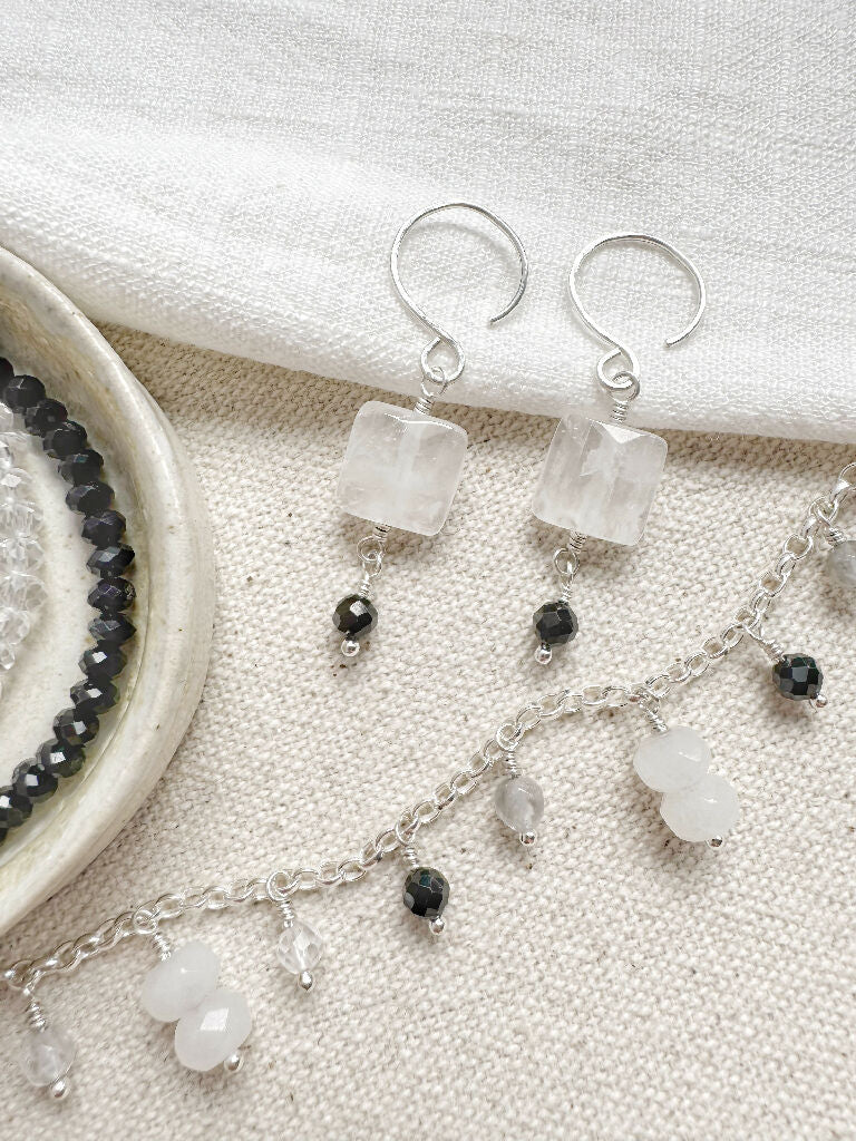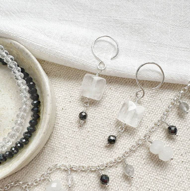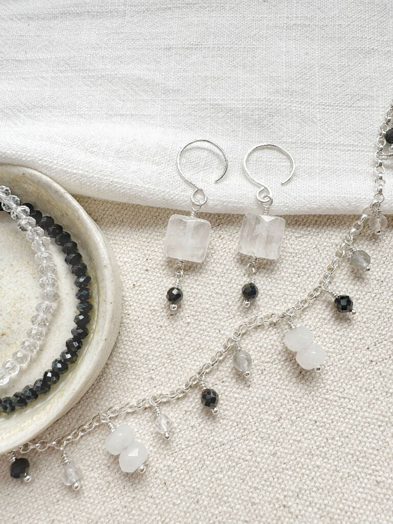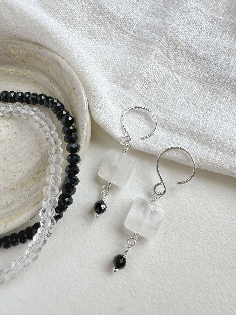 𝐌𝐚𝐭𝐞𝐫𝐢𝐚𝐥𝐬 - 10mm faceted square of rock crystal (quartz) and 4mm black agate gemstone beads. - sterling silver chain Please note that the square cut gemstones vary in cut, size and colour.