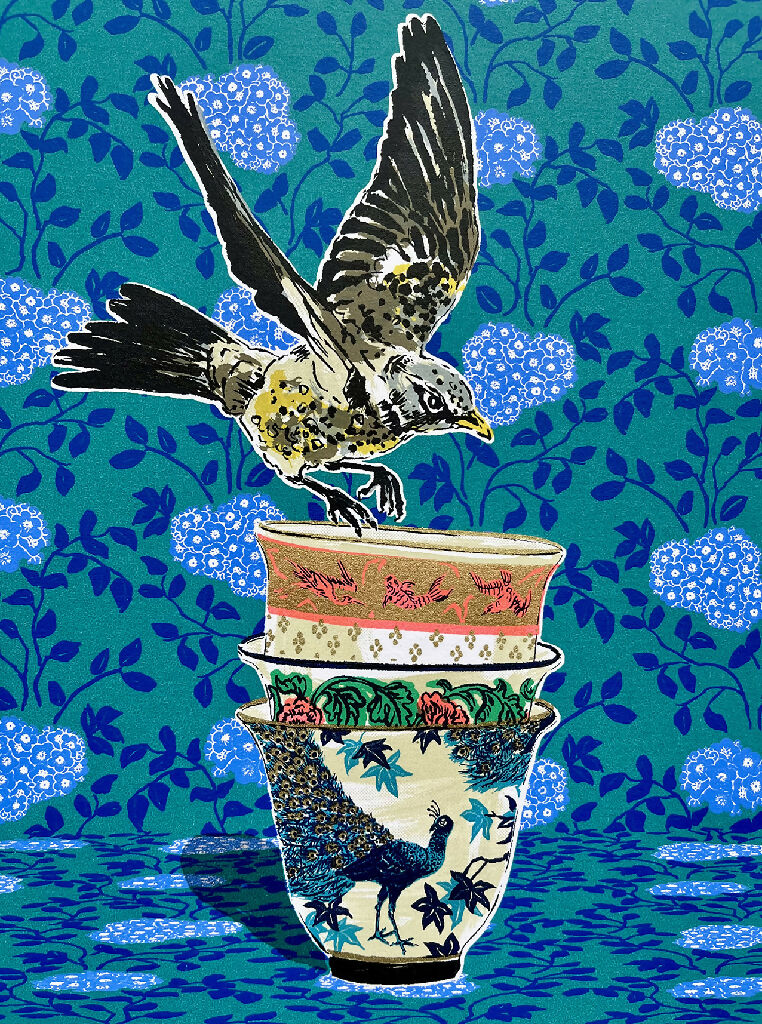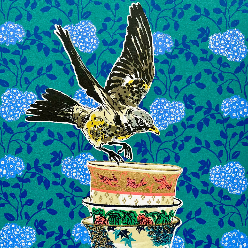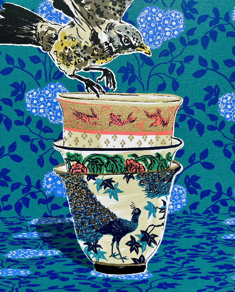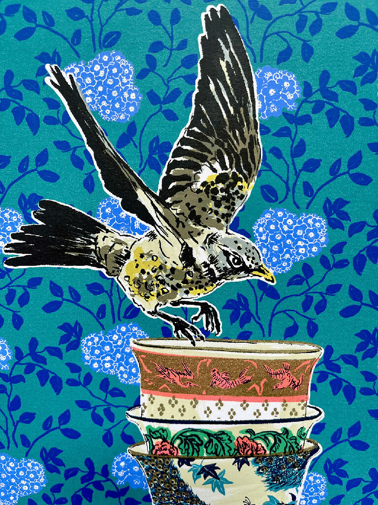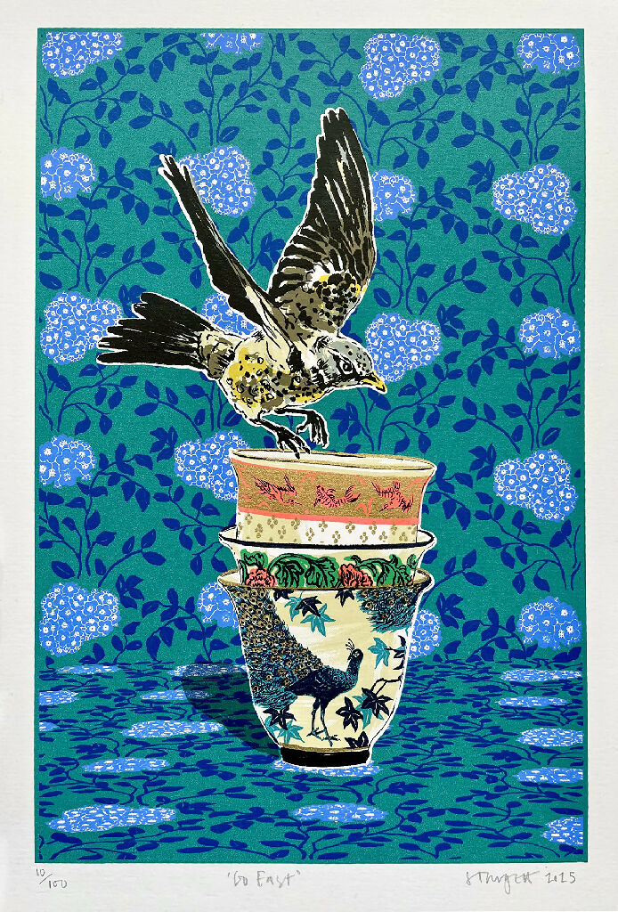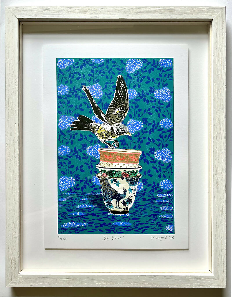 ‘Go East’ is a limited edition 15 colour screen print on Fabriano paper. The background wallpaper is a brightly coloured Japanese style botanical pattern and the print plays on various shades of blue throughout with small pops of bright pink, green and gold ink .
