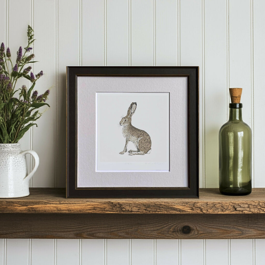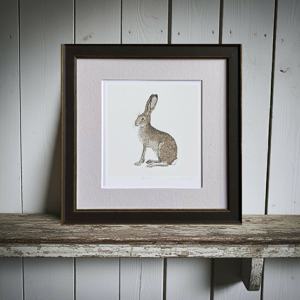 Inspired by the beauty of the British Countryside this hand-drawn print with an etched feel depicts a Hare on a simple white ground from an original artwork.