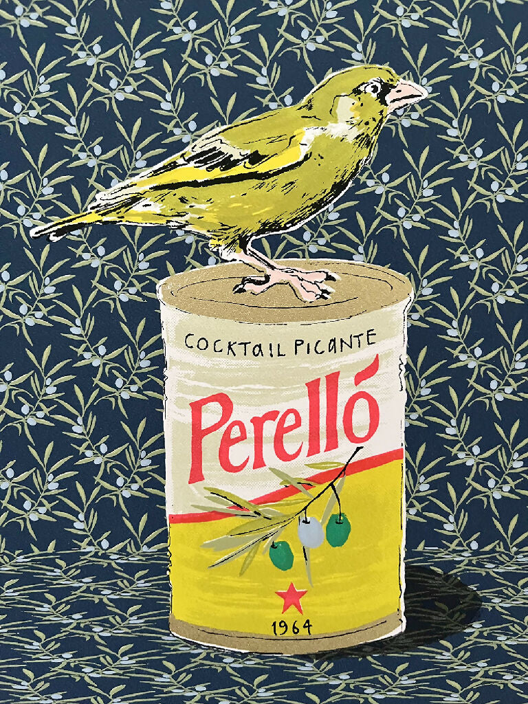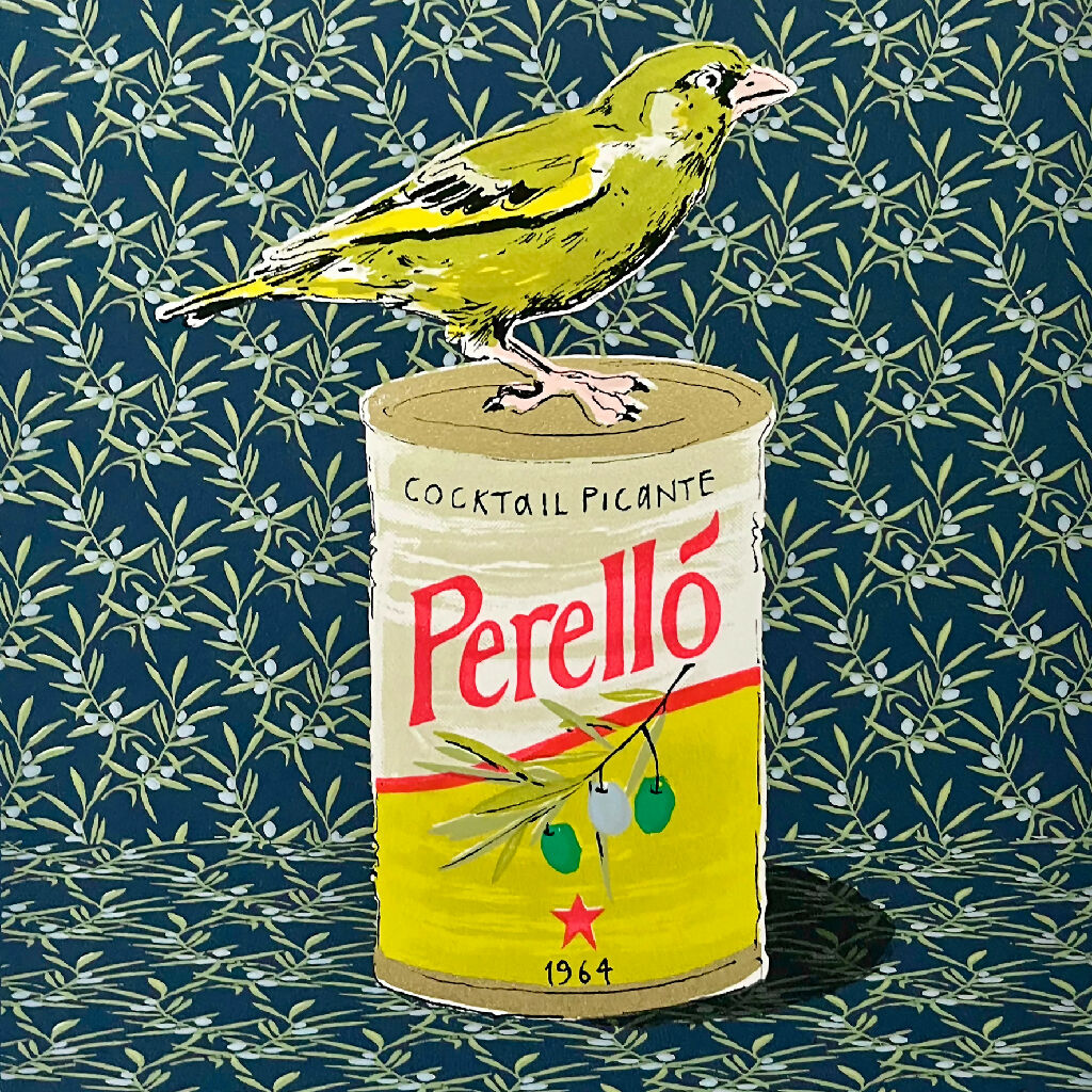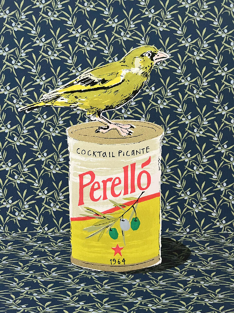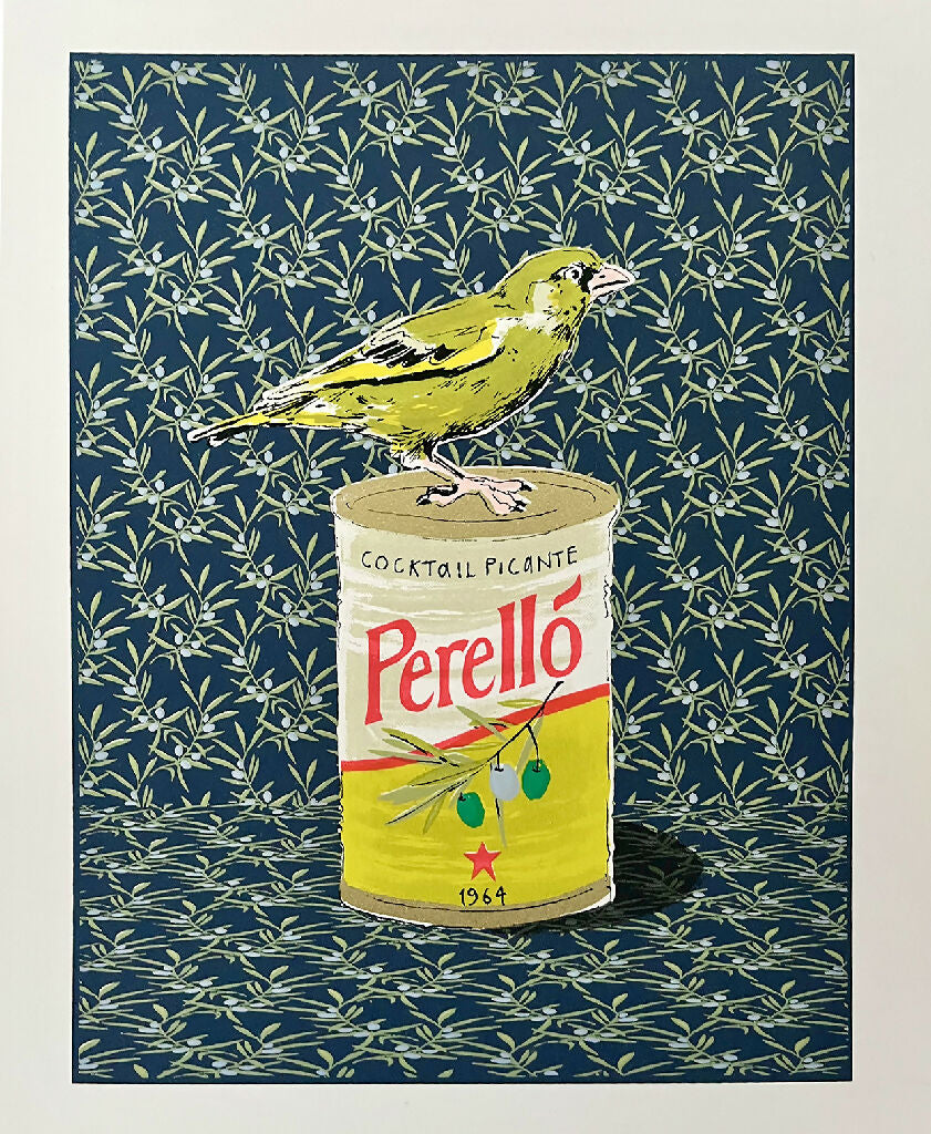 ‘Olive Green (finch)’ is a limited edition 12 colour screen print on Fabriano paper. The background wallpaper is a dark blue with olive branches and additional gold ink on the tin. Featuring a Greenfinch and an iconic perello Olive tin.