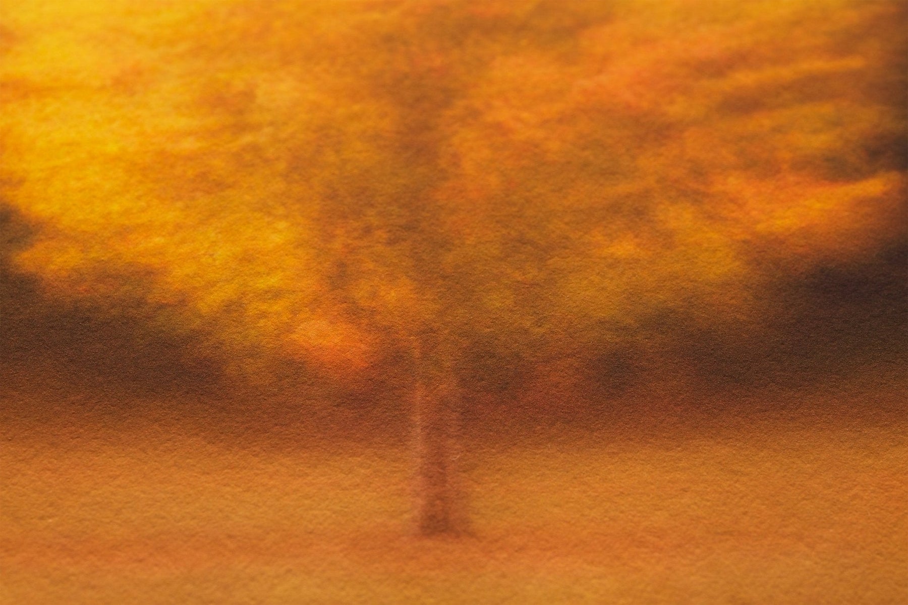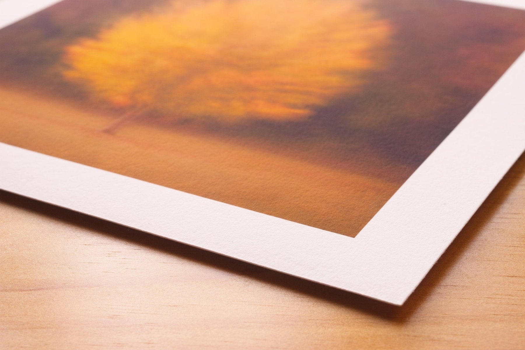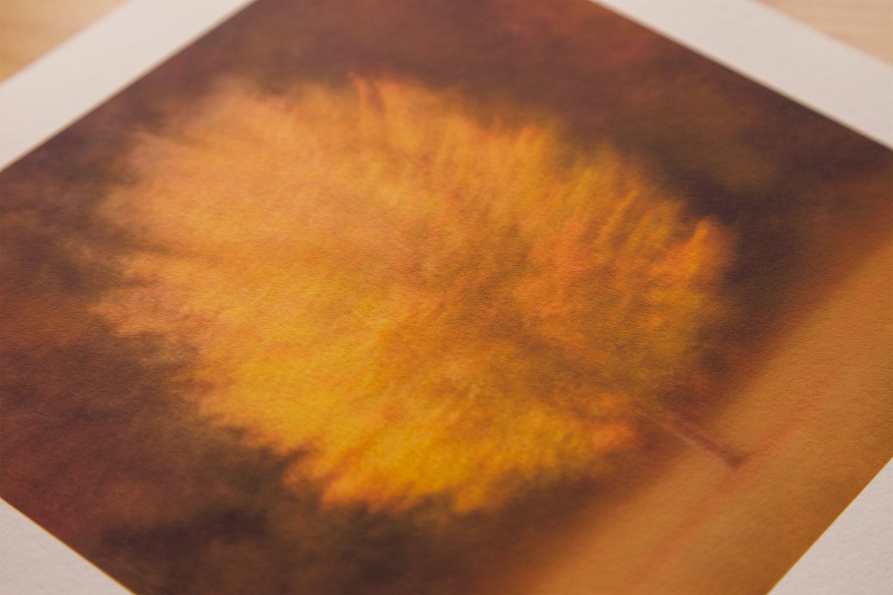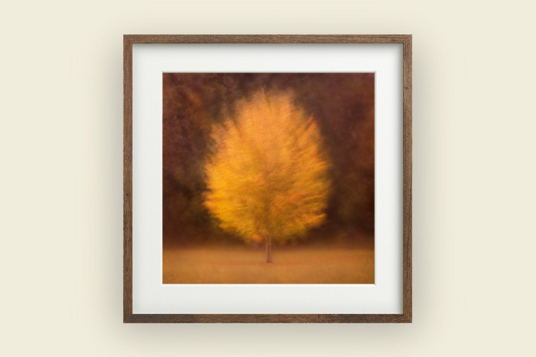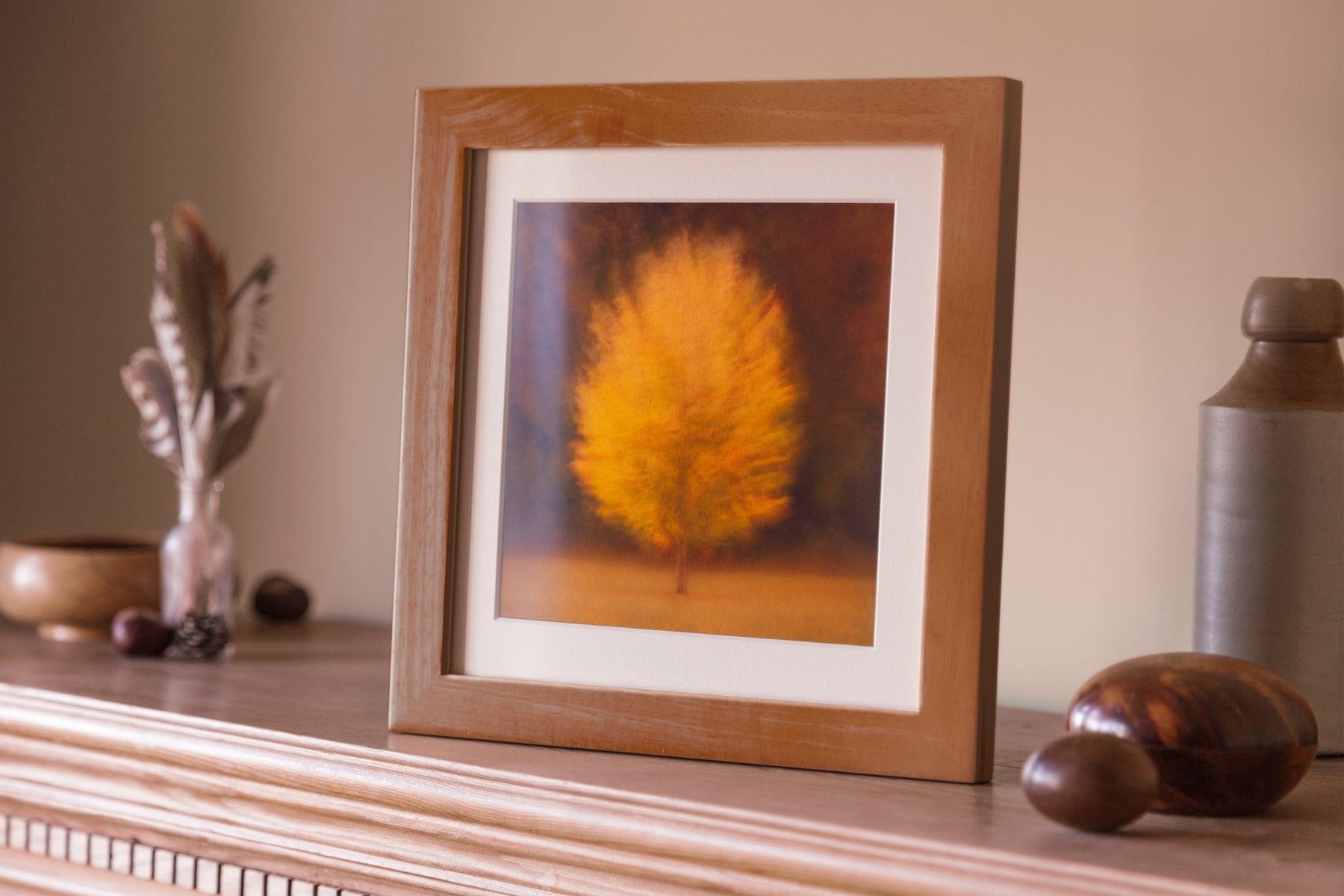 Immerse yourself in the beauty of autumn with Orli, a stunning fine art print that radiates warmth and tranquillity.A maple tree captured in the evening light in autumn. The golden leaves will bring a vibrant splash of warming colour into your home enhancing a cosy interior design. With its bold square symmetry and modern aesthetic, it makes a striking centre piece on any wall. This beautiful image captures the essence of the season, blending rich amber, deep ochre, and soft brown tones to create a serene and inviting atmosphere.