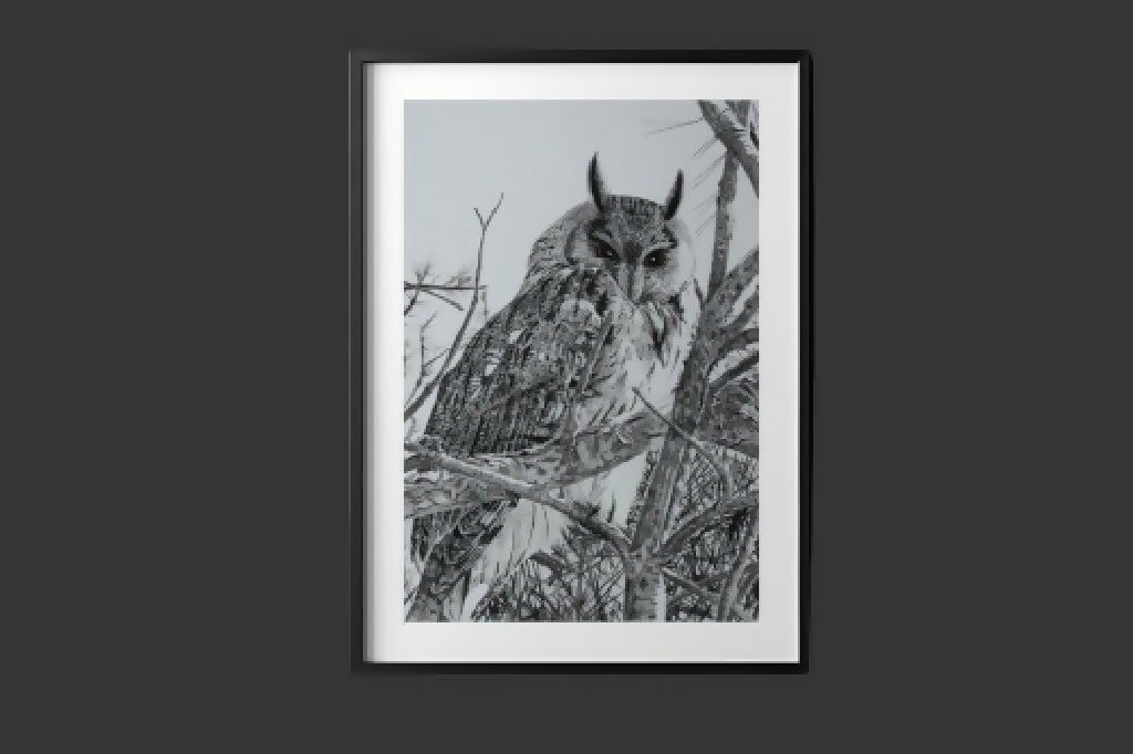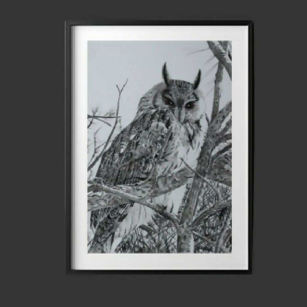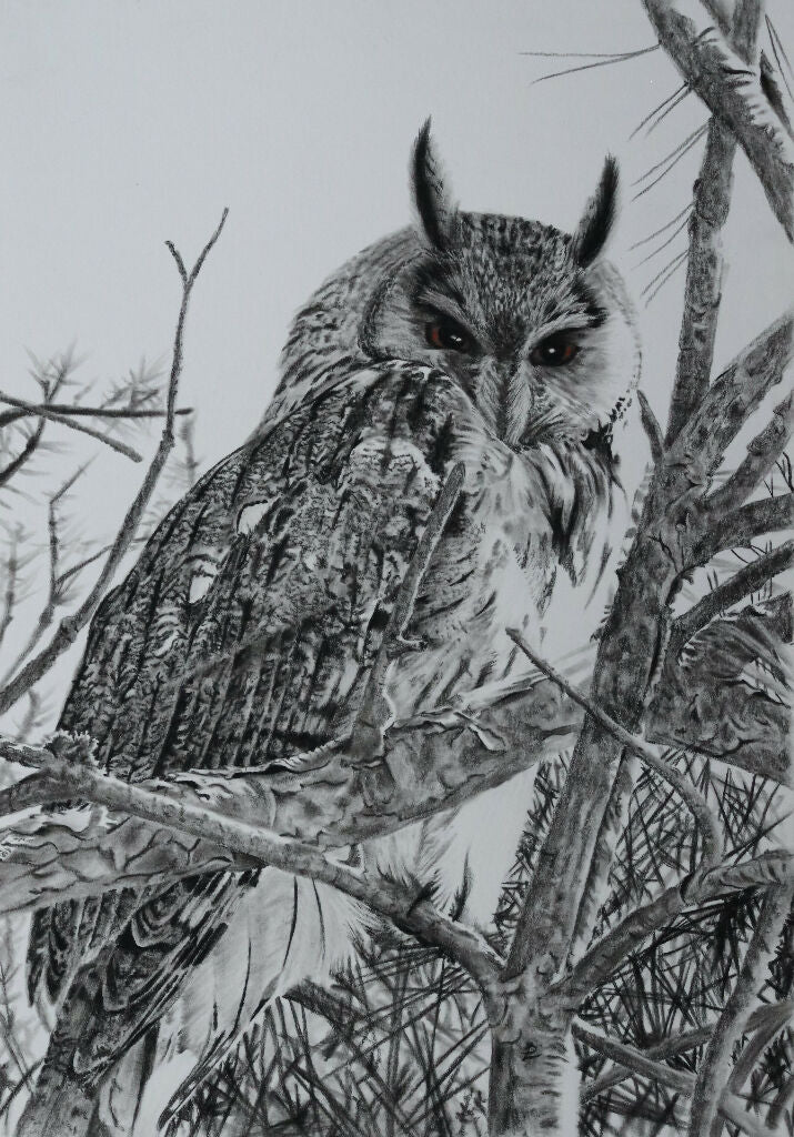 An original drawing of a female long-eared owl, inspired by my trip to Sweden's island of Öland, famous for birdwatching.
