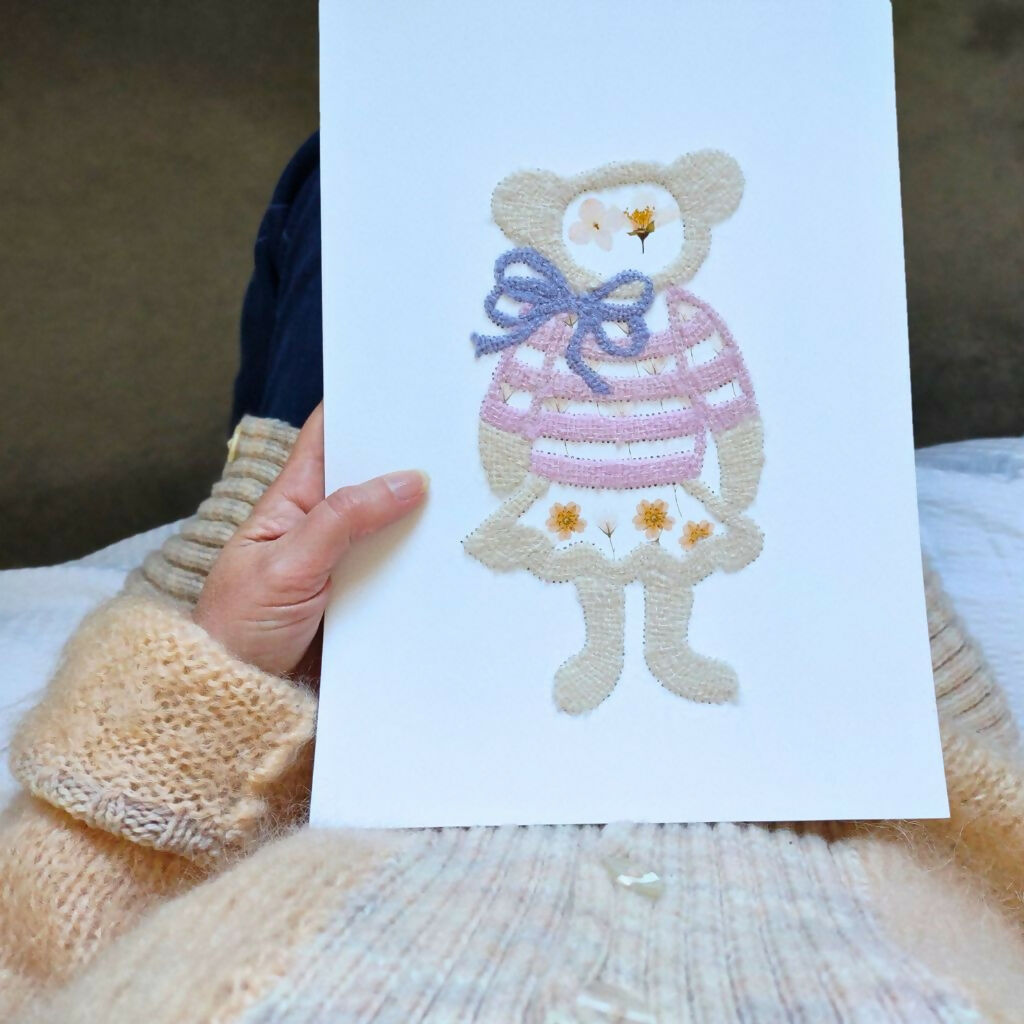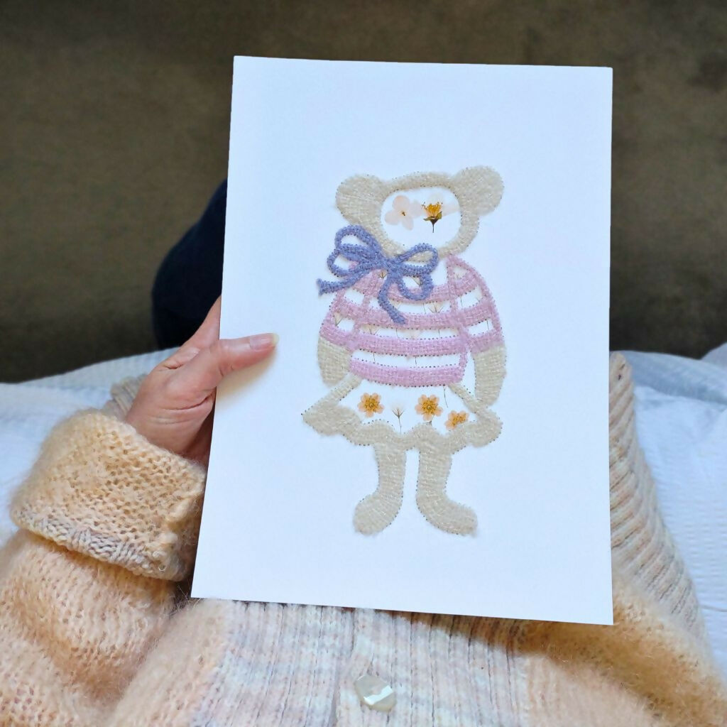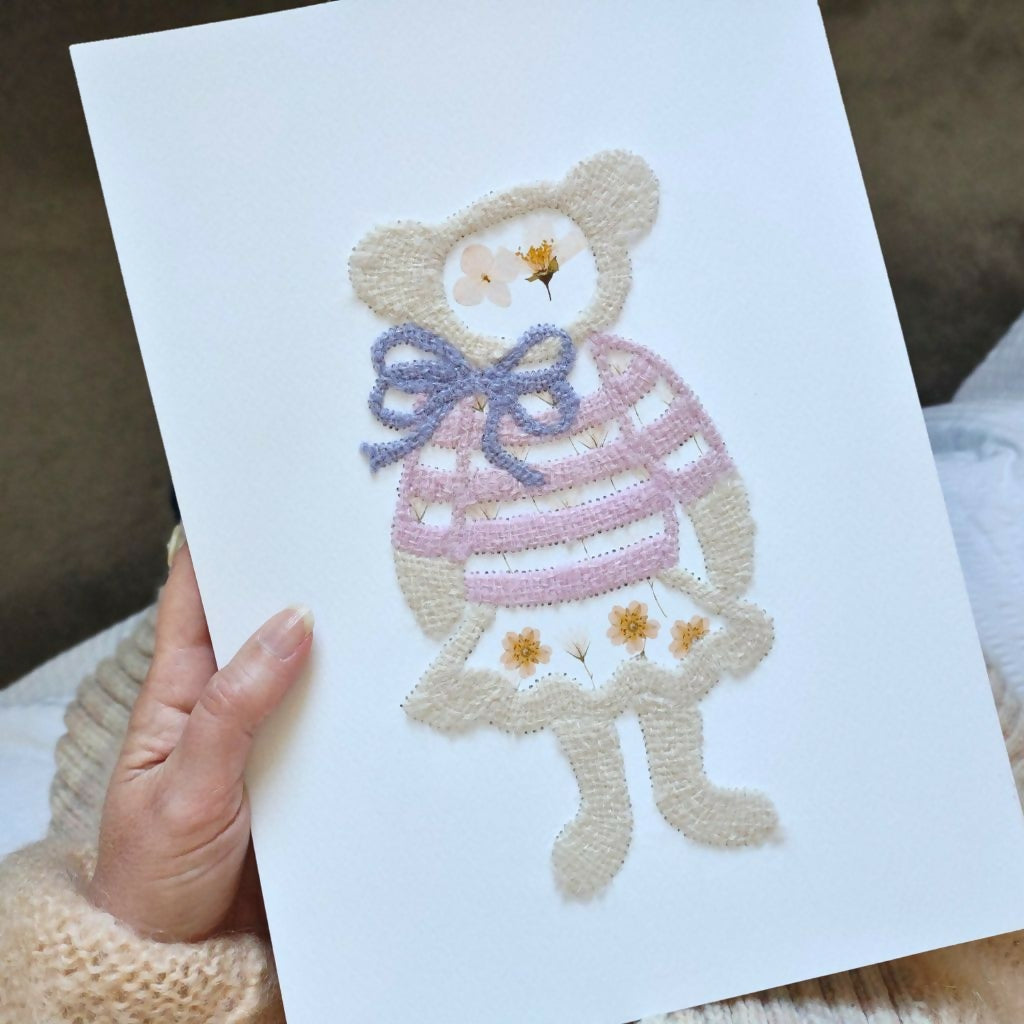 Designed using pressed flowers and hand embroidered silk and alpaca stitches, the detail in this bear embroidery are stunning and sure to be loved for a lifetime and beyond.