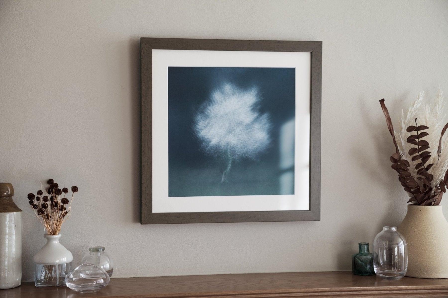 Enhance your space with the quiet elegance of Virva, a breathtaking fine art print that captures the ethereal beauty of a solitary blackthorn tree in full bloom. Set against a teal water backdrop, this piece embodies a sense of tranquillity, with its striking contrast of bright white blossom. This print makes a perfect addition for a modern country cottage, or farmhouse-style interiors.