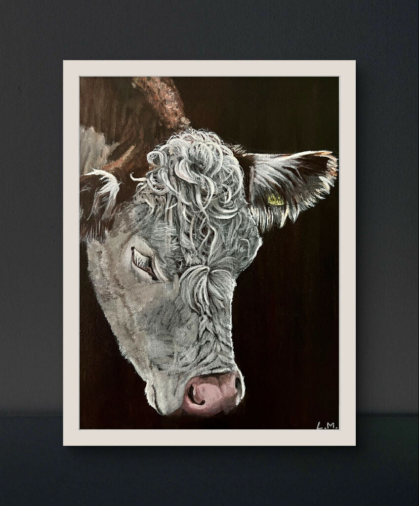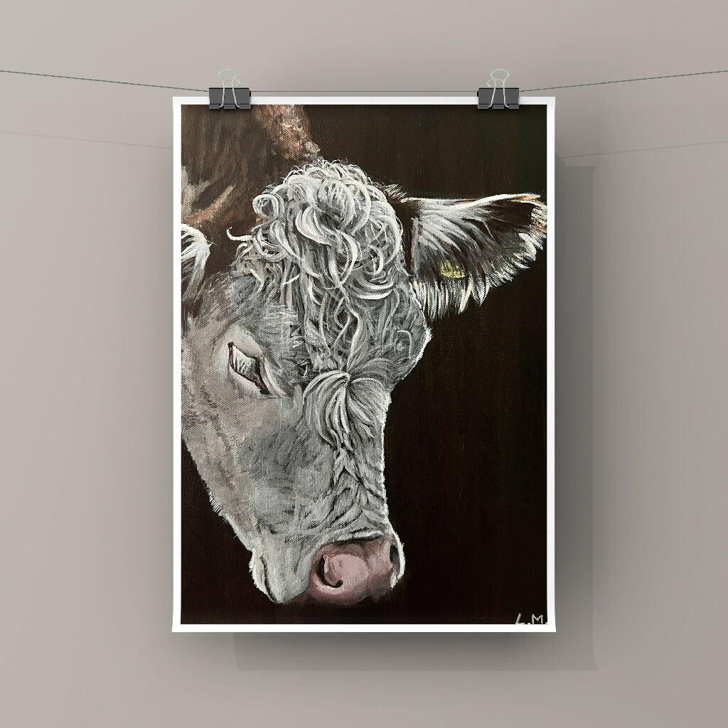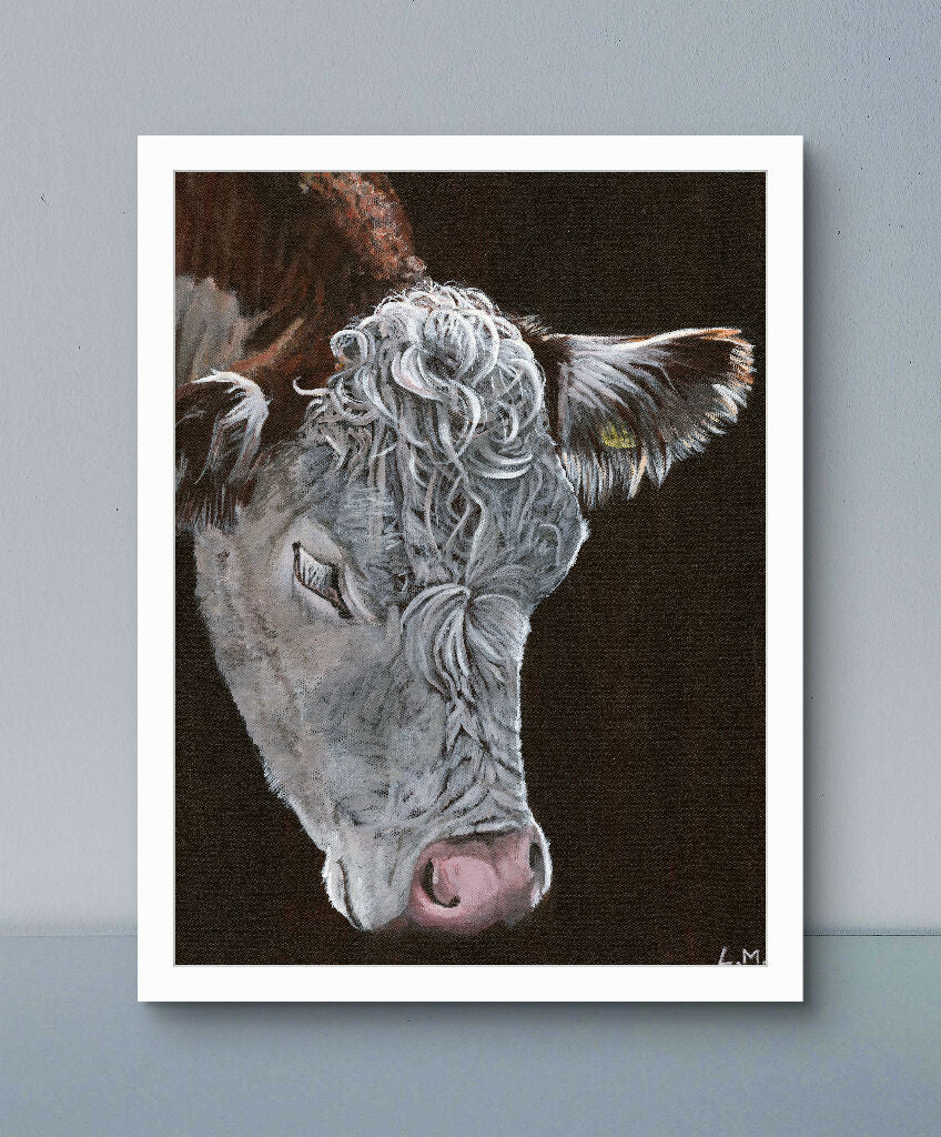 The original acrylic painting is of a beautiful Hereford cow in Wiltshire, UK. It was a drizzly day making their coats even more distinctively curly.