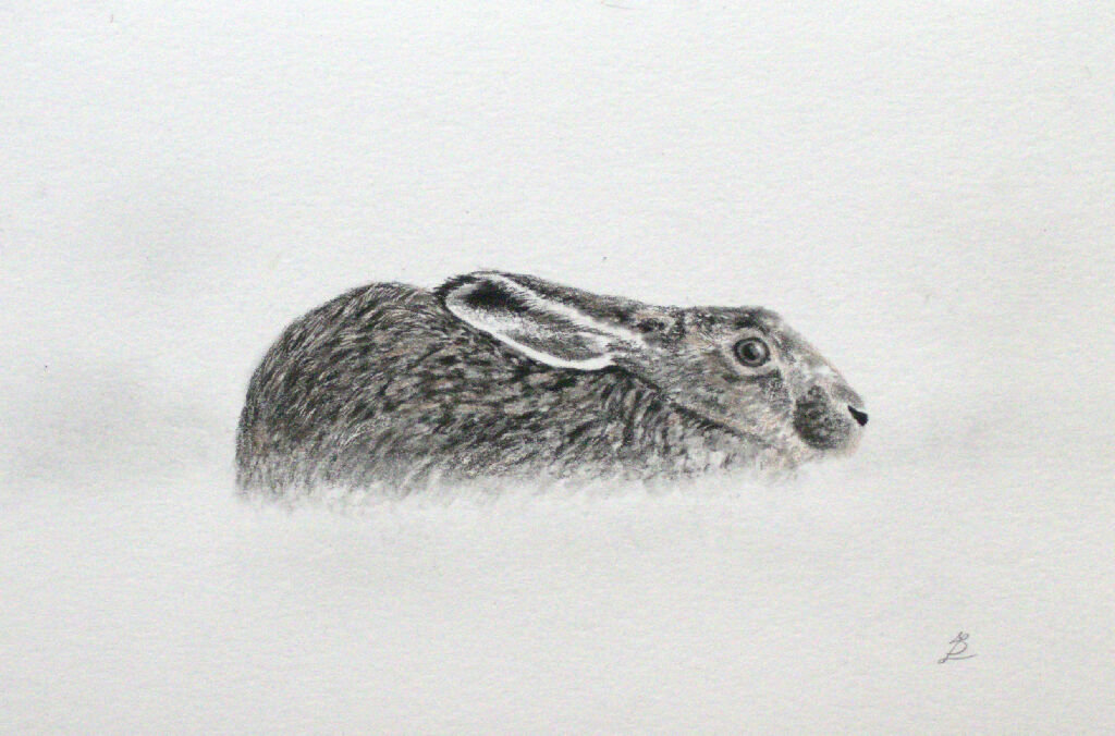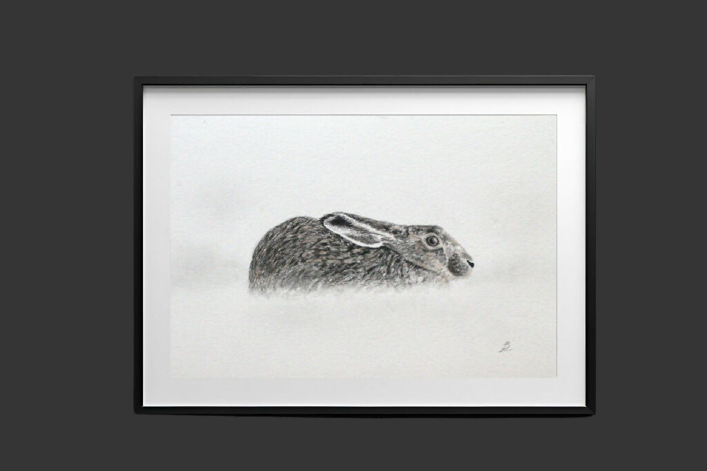 A detailed and realistic artwork of a brown hare huddled in the snow.