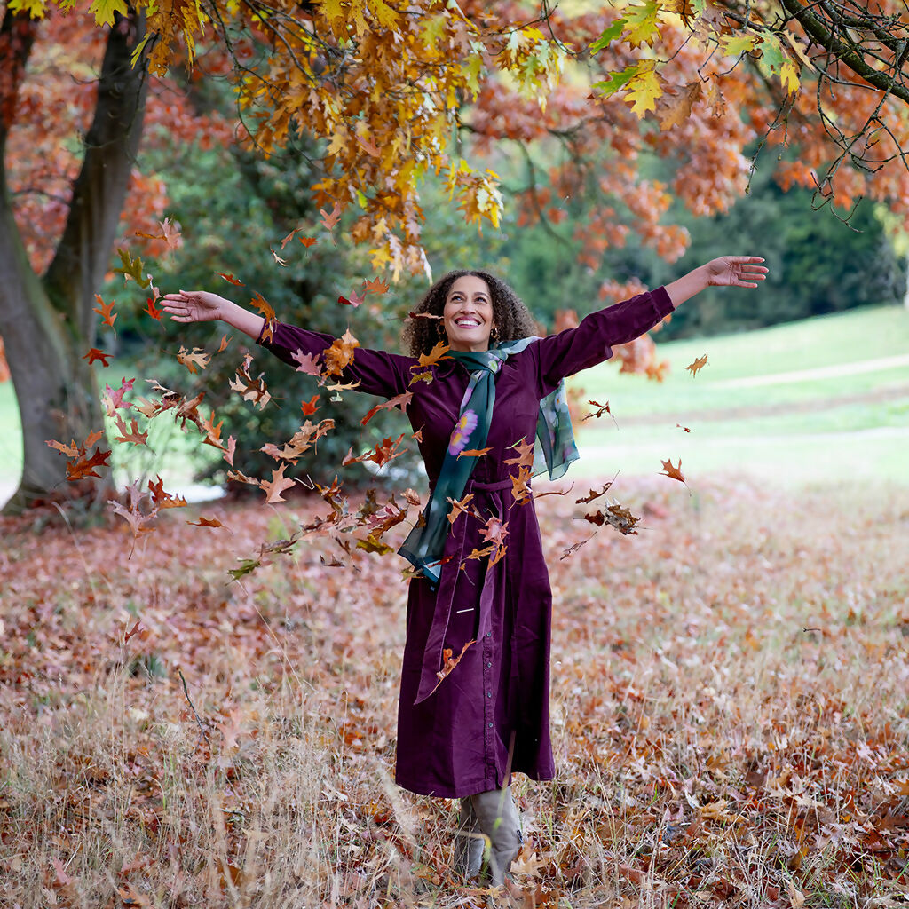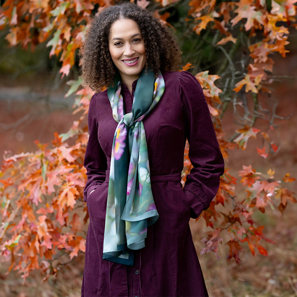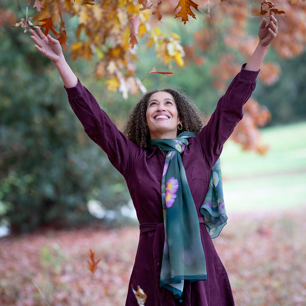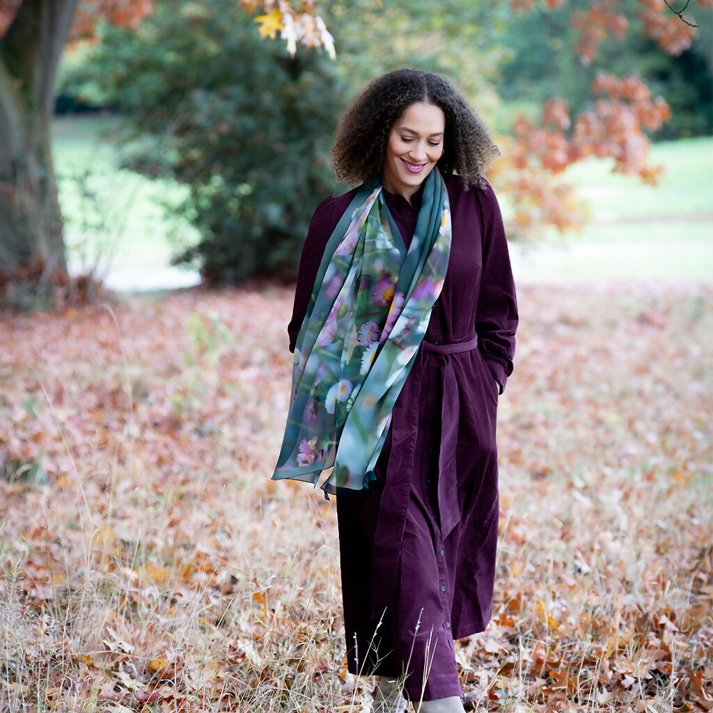 Inspired by the joyful abundance of Erigeron daisies that thrive in my cottage garden, this elegant scarf celebrates their delicate beauty in soft white and pink tones. Each bloom was lovingly photographed to create a unique floral design that captures the spirit of an English garden.