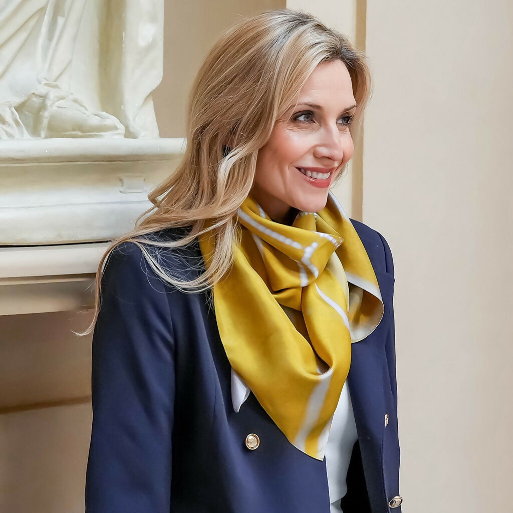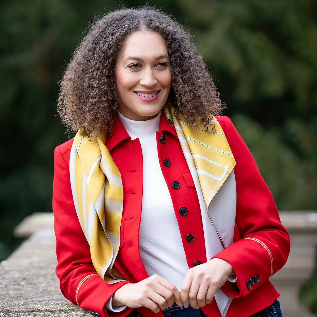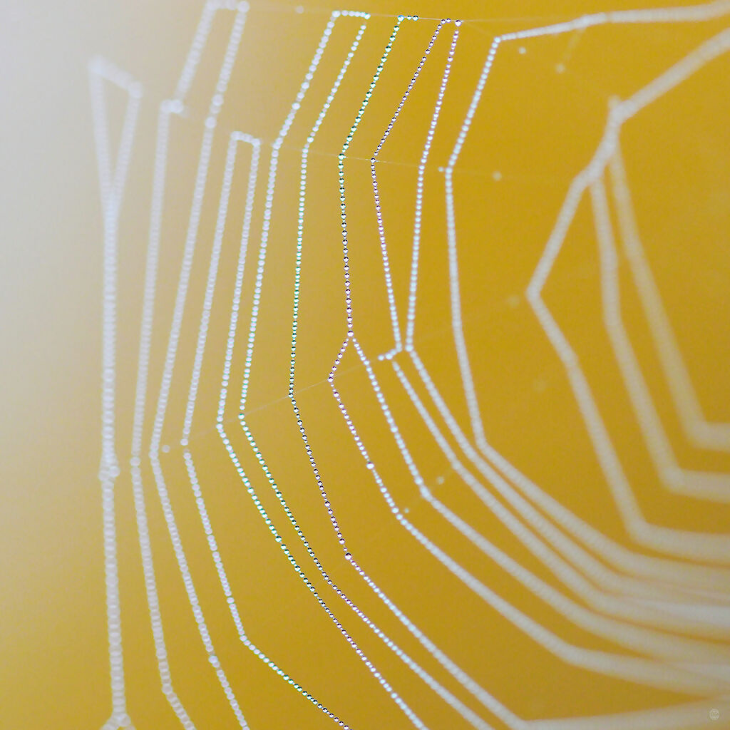Inspired by a delicate cobweb strung with morning dew, glistening like tiny jewels on an old rosebush outside the cottage door, this rich golden silk scarf captures the quiet be...