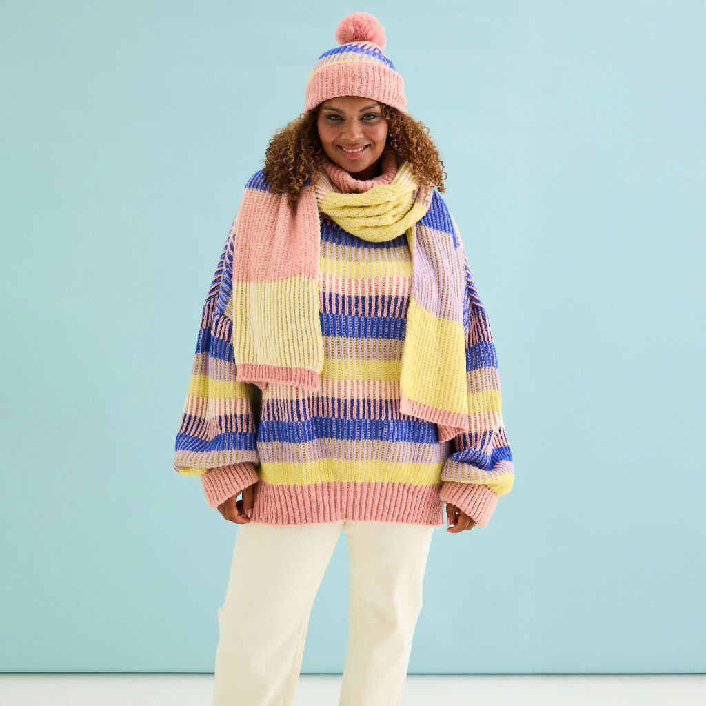 Phoebe is your winter pastel pop 💗. Designed by Cara in stripes of pink, lemon yellow and blue with a fluffy pom pom on top, she’s cosy, playful and perfect for happy winter dressing.Â