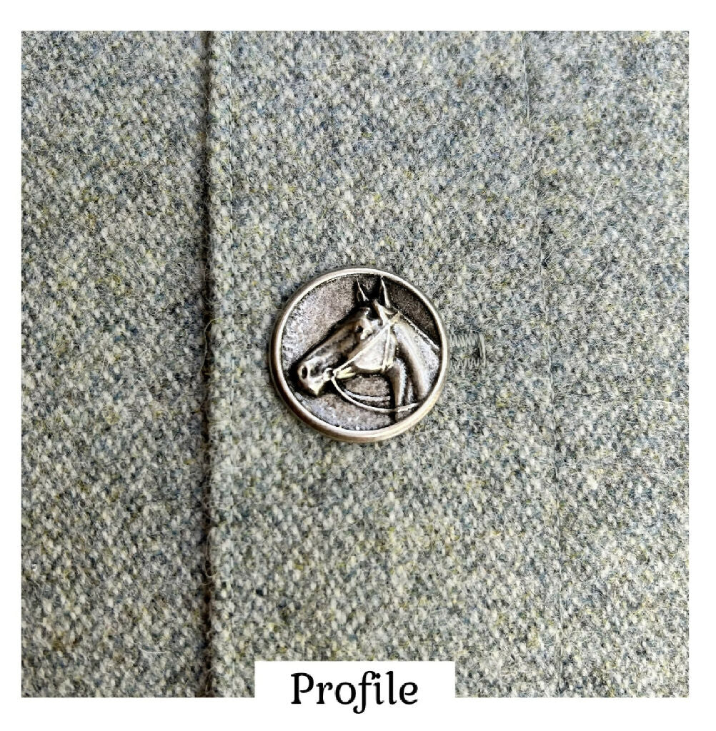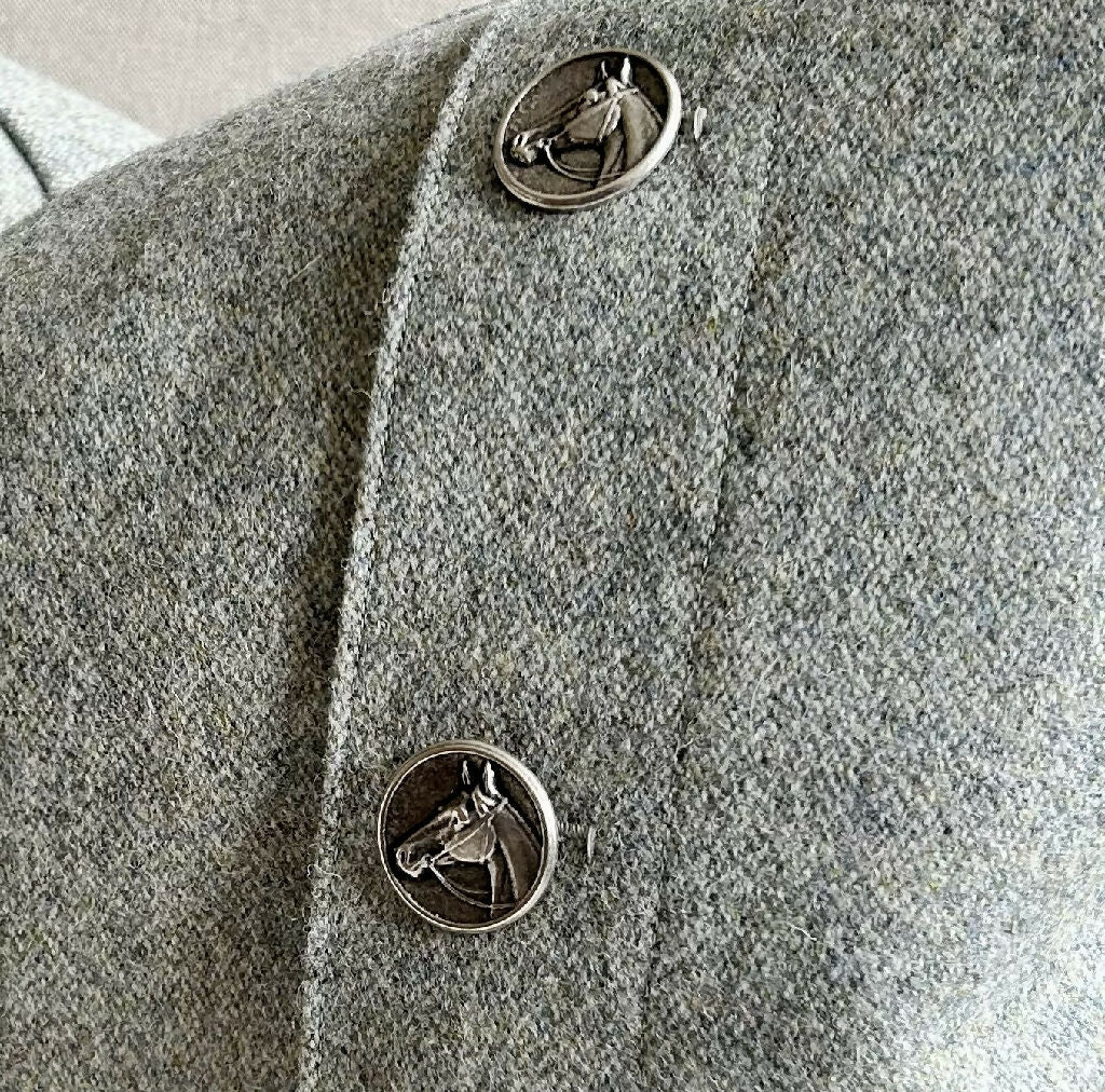 Closure: Closed with three metal horse buttons in brushed silver