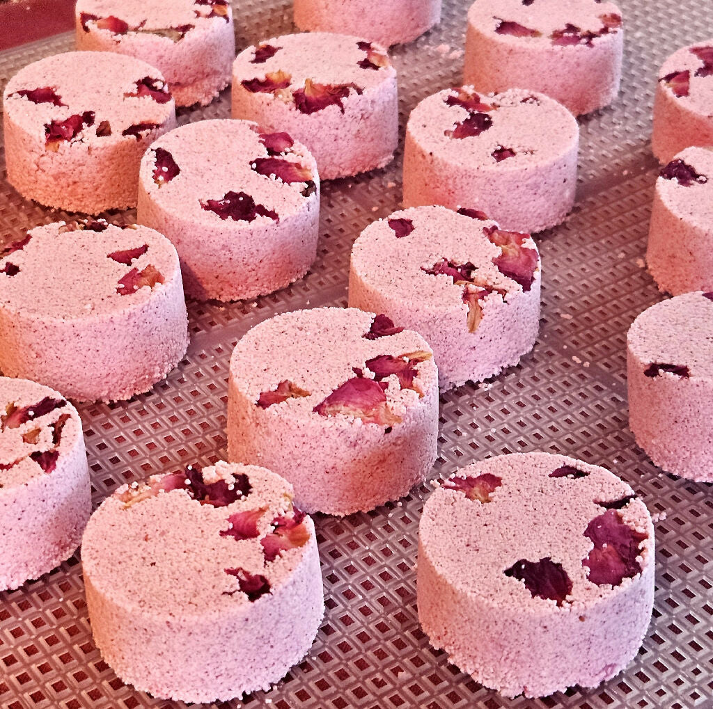 Each 20g steamer is delicately finished with real dried rose petals and naturally coloured with beetroot powder, giving them their soft pink hue- no synthetic dyes added.