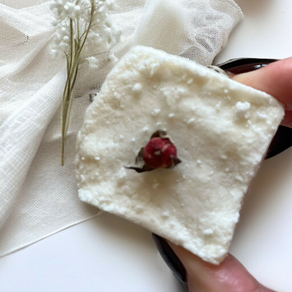 A richly nourishing bath melt made with organic Shea Butter and a gentle foaming surfactant, designed to soften the skin while creating a creamy, comforting bath experience. Finished with a delicate red rose bud for a romantic touch.